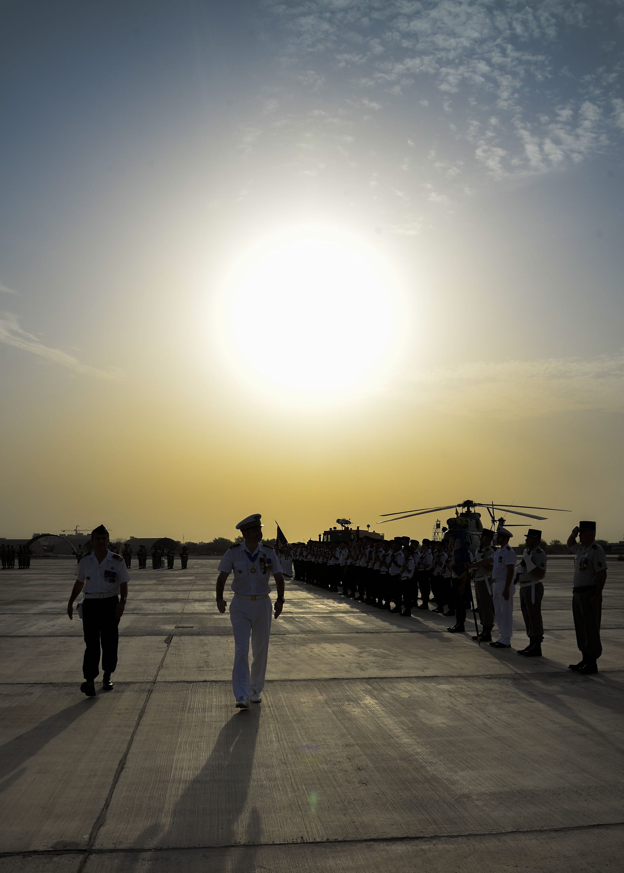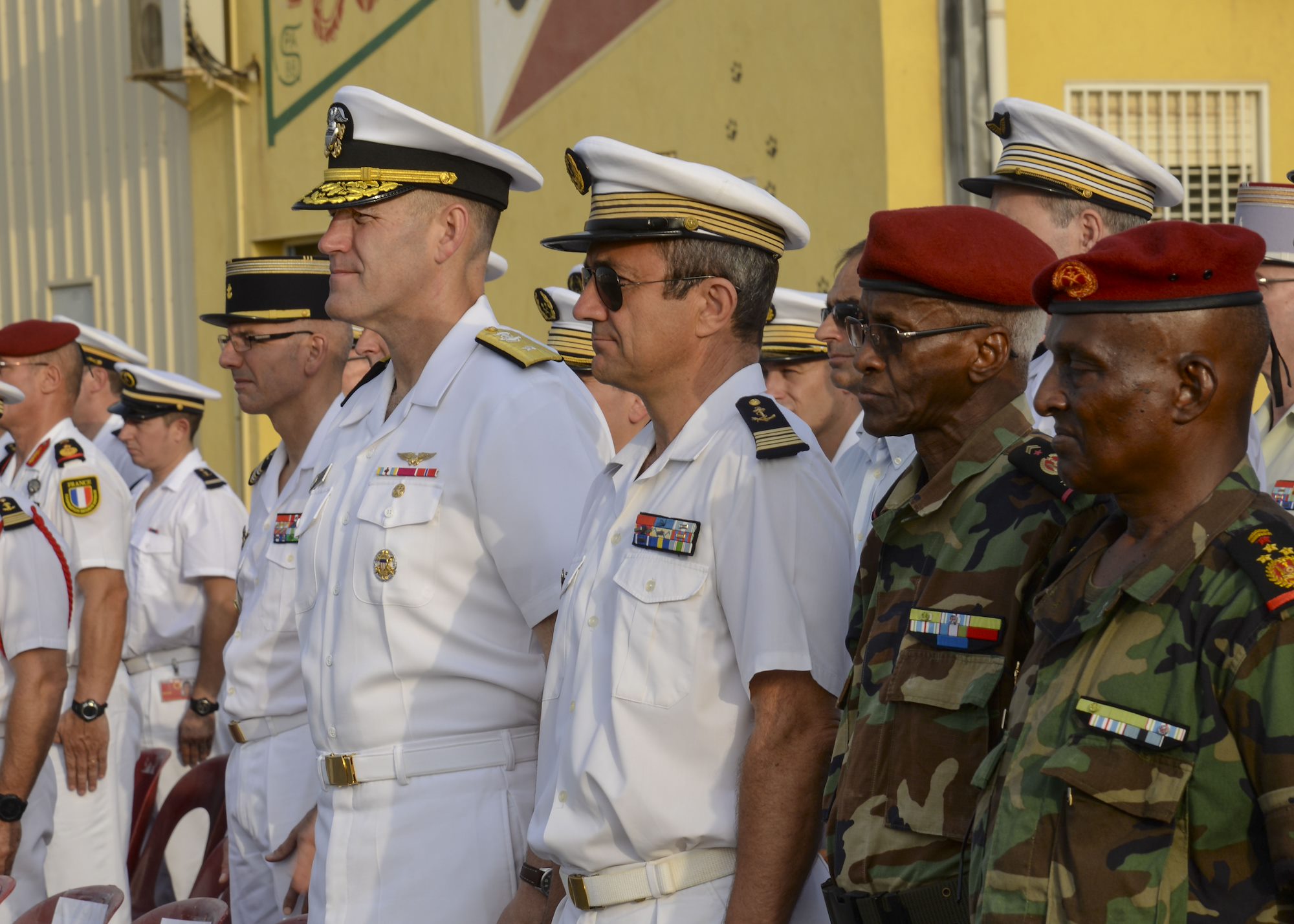 U.S. Navy Rear Adm. William W. Wheeler, Combined Joint Task Force-Horn of Africa vice commander, left, watches a French military parade in commemoration of Bastille Day (also commonly referred to as French National Day) at the French base in Djibouti, July 14, 2016. The Honorable Tom Kelly, U.S. Ambassador to Djibouti, as well as military members from Italy, Japan and others attended the ceremony. (U.S. Air Force photo by Staff Sgt. Benjamin Raughton/Released)