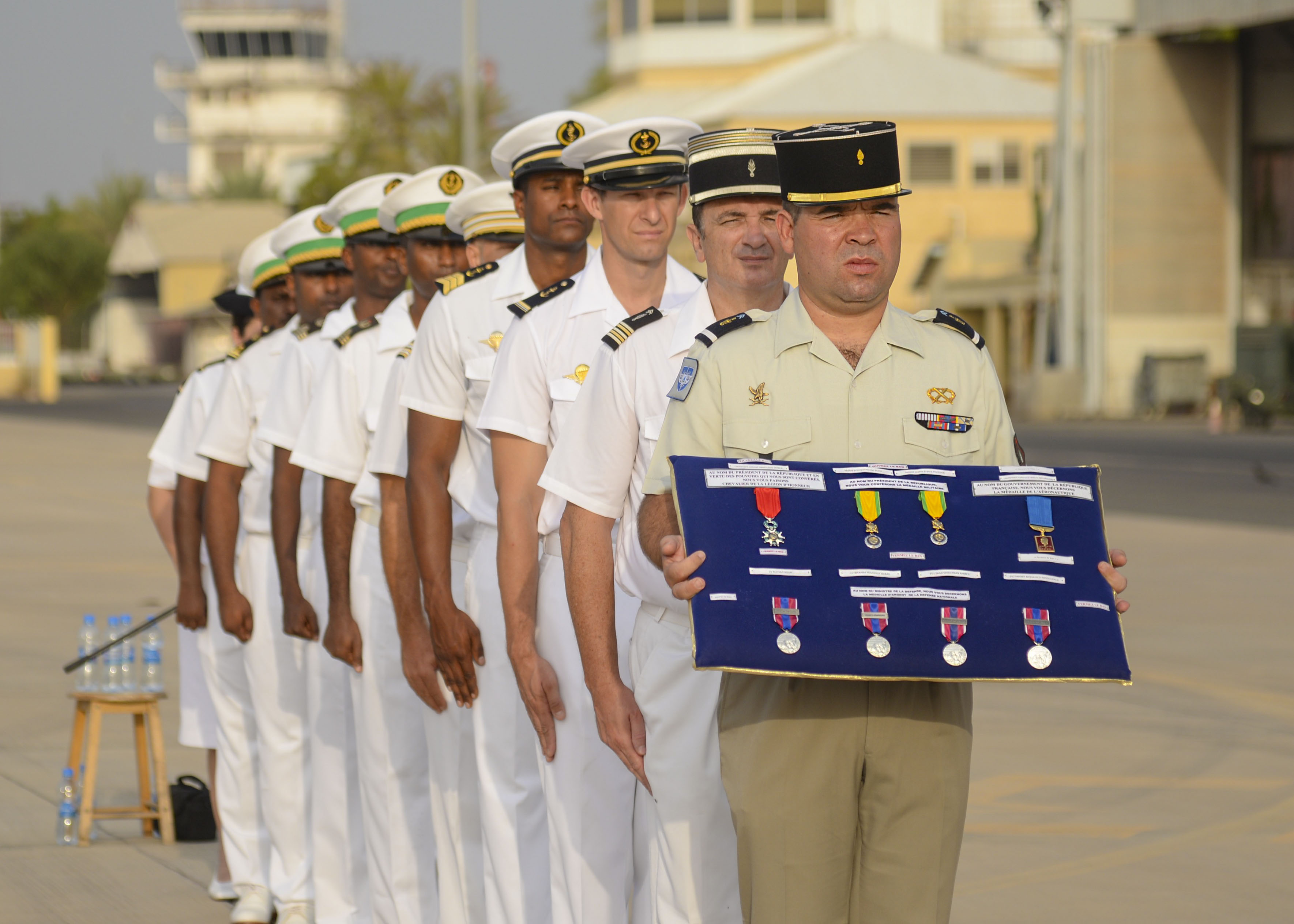 A French senior enlisted leader holds an awards display during a Bastille Day ceremony on the French base in Djibouti, July 14, 2016. Also commonly referred to as French National Day, Bastille Day is an annual celebration of French unity that began one year after the storming of the Bastille in 1789. France established its presence in Djibouti (then called the Protectorate of Obock) in the 1880s. (U.S. Air Force photo by Staff Sgt. Benjamin Raughton/Released)