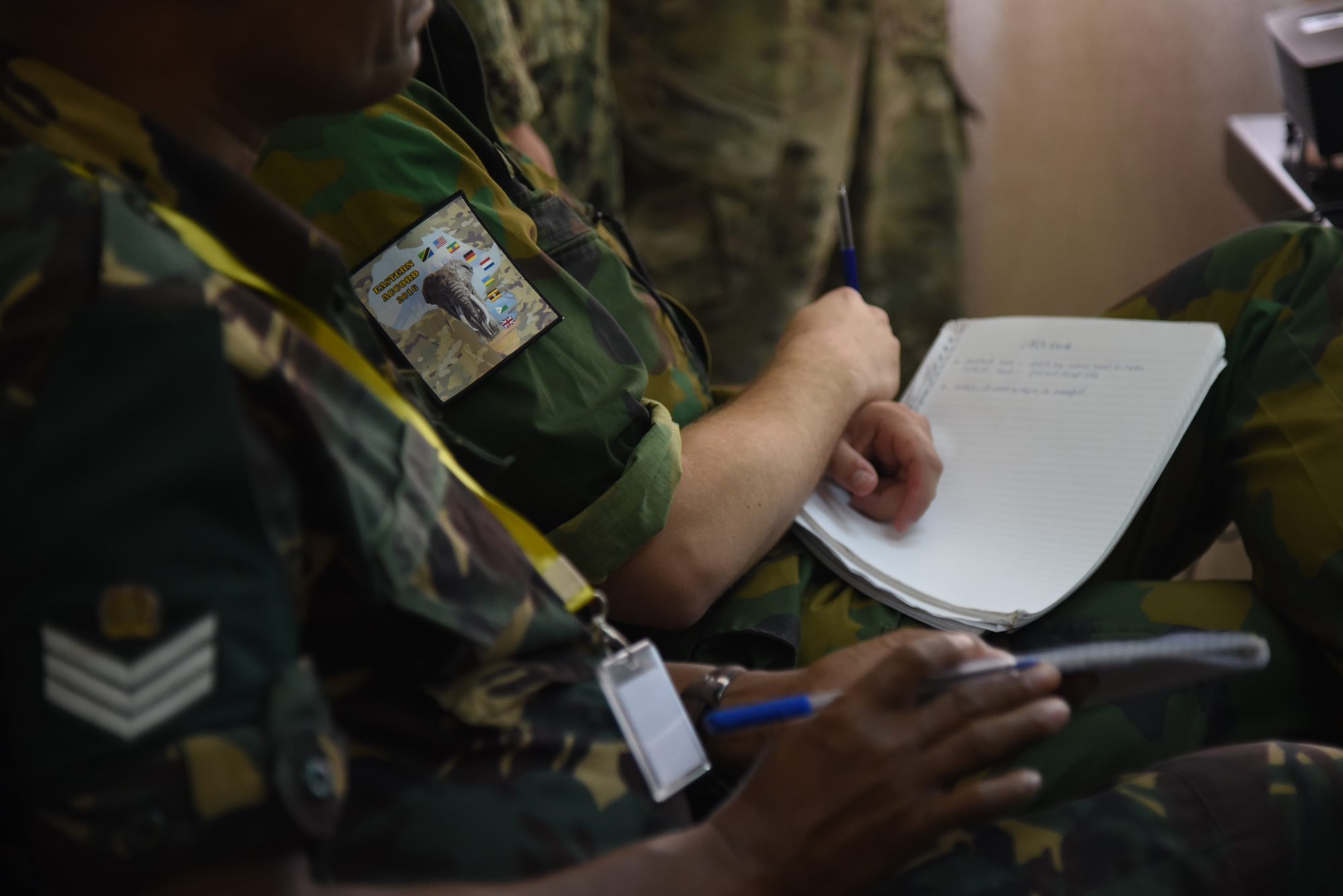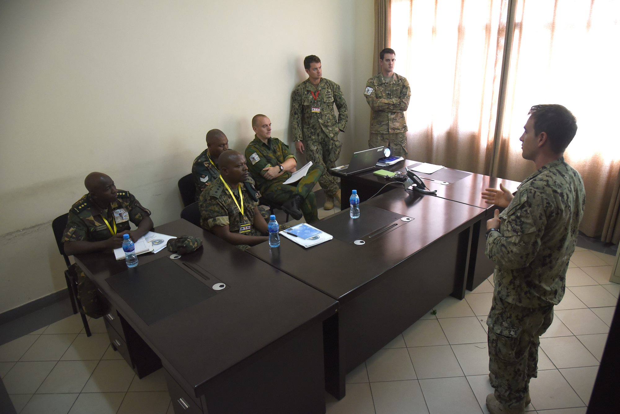 DAR ES SALAAM, Tanzania – Eastern Accord 2016 participants attend a counter-improvised explosive device course on July 14, 2016, to effectively learn how to combat IEDs at the operational level during academic training at the Tanzanian Peacekeeping Training Centre in Dar es Salaam, Tanzania. EA16 is an annual, combined, joint military exercise that brings together partner nations to practice and demonstrate proficiency in conducting peacekeeping operations. (U.S. Air Force photo by Staff Sgt. Tiffany DeNault)
