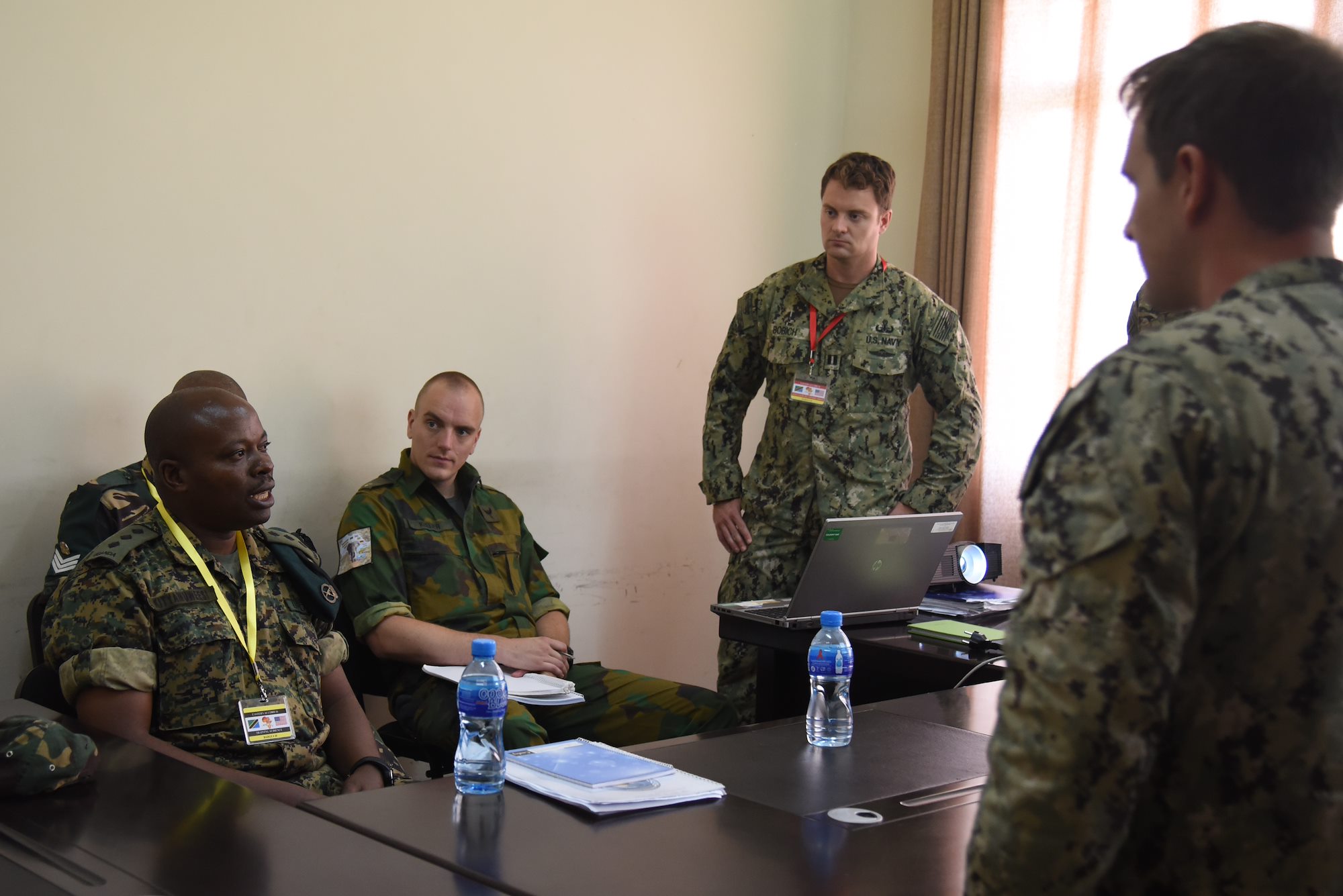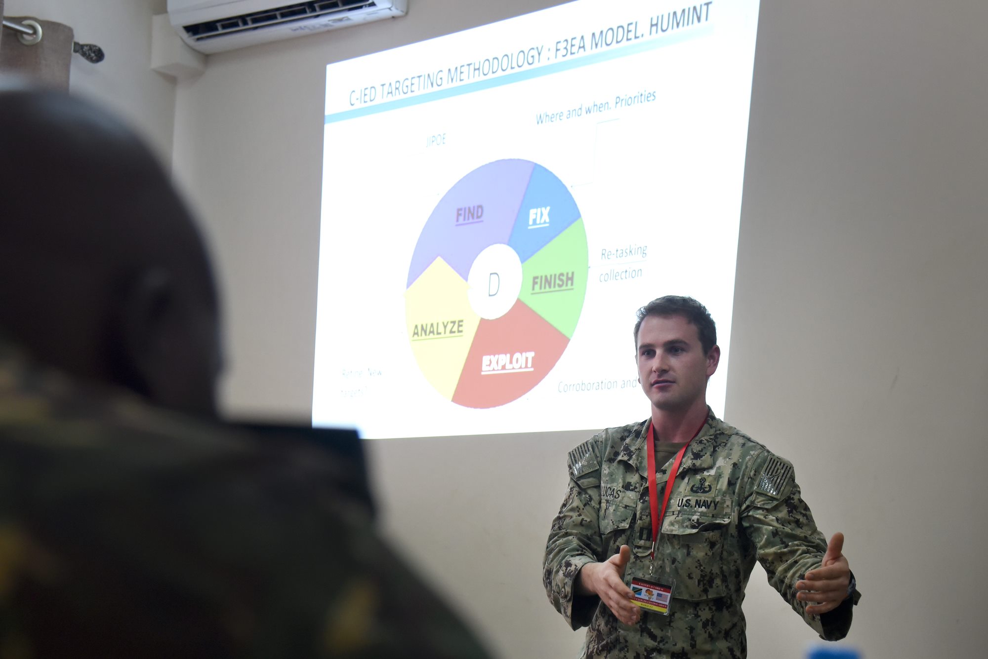 DAR ES SALAAM, Tanzania- U.S. Navy Lt. Allan Lucas, Task Force Sparta explosive ordnance disposal platoon leader at Combined Joint Task Force-Horn Of Africa, instructs a portion of a counter-improvised explosive device course to Dutch, Tanzanian and Ugandan exercise participants during Eastern Accord 2016, at the Tanzanian Peacekeeping Training Centre, in Dar es Salaam, Tanzania. EA16 is an annual, combined, joint military exercise that brings together partner nations to practice and demonstrate proficiency in conducting peacekeeping operations. (U.S. Air Force photo by Staff Sgt. Tiffany DeNault)