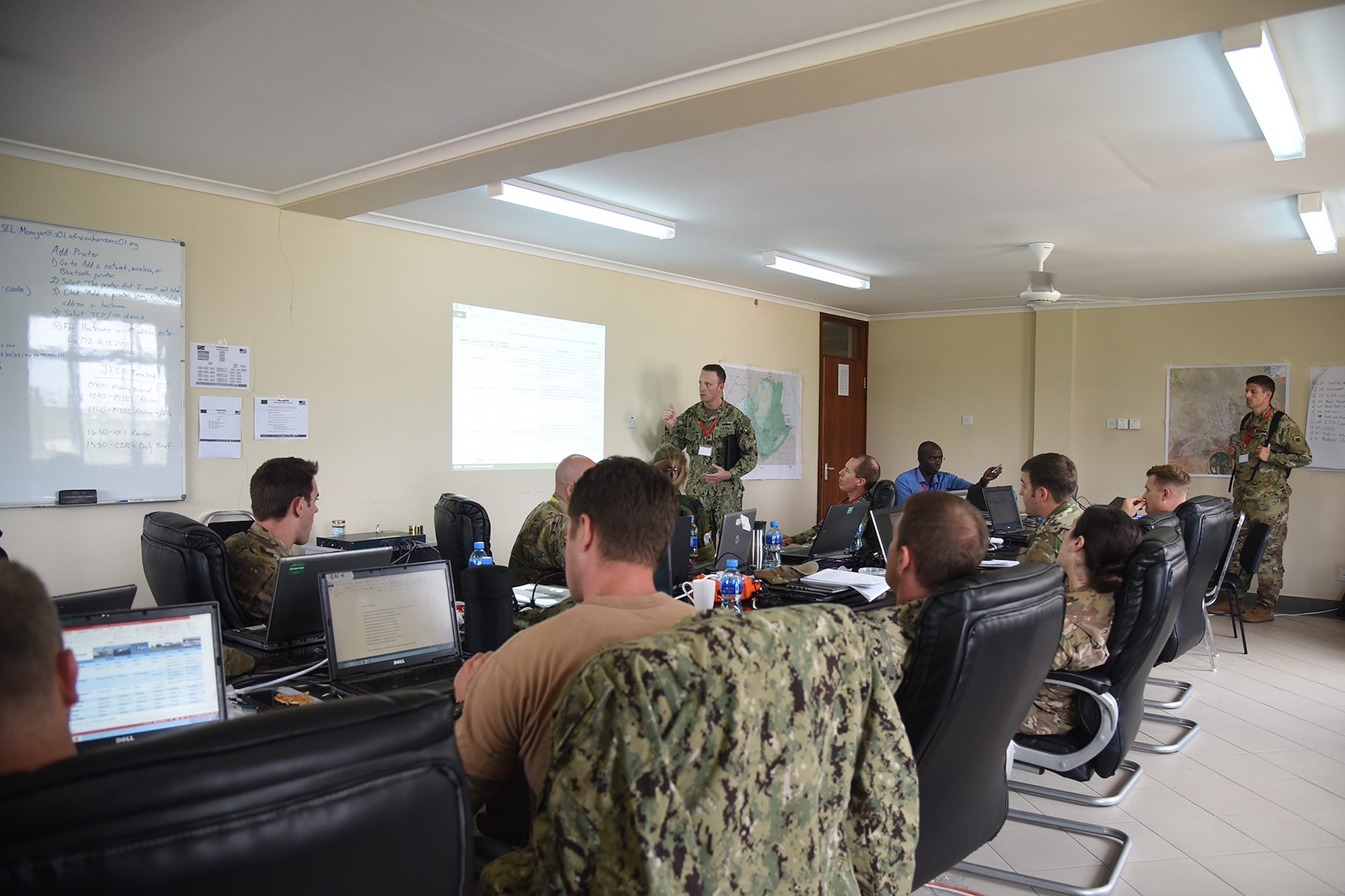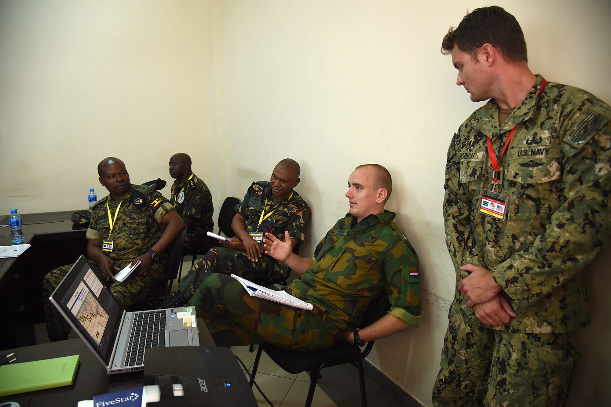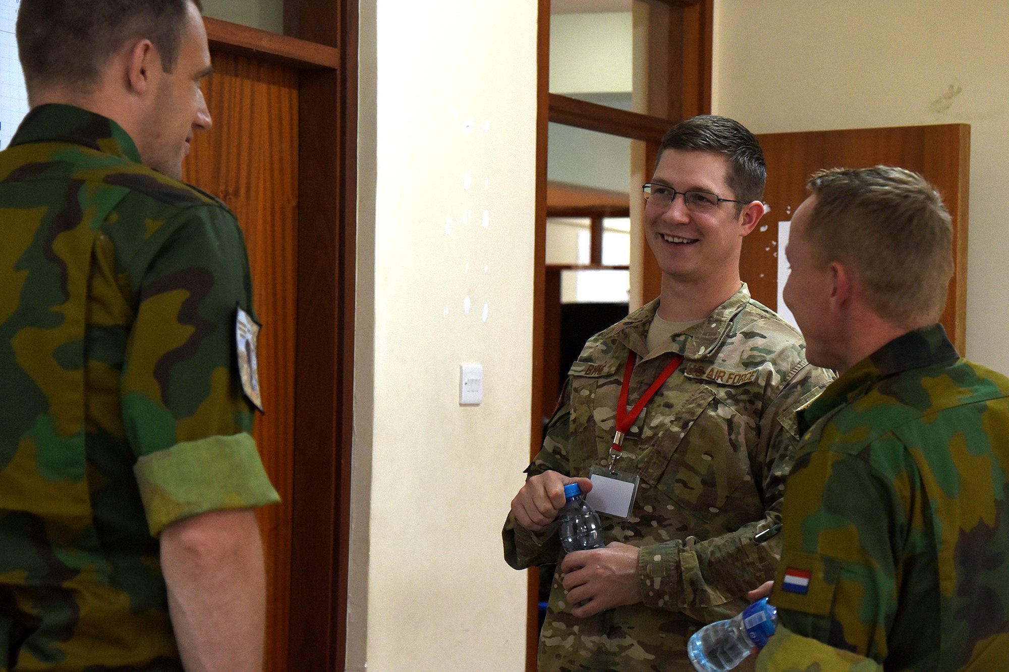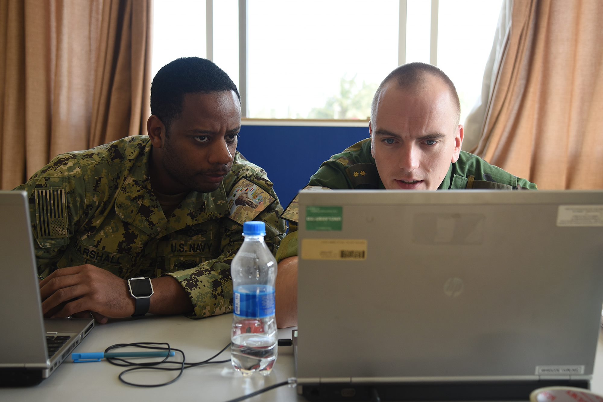 DAR ES SALAAM, Tanzania – U.S. Navy Petty Officer 1st Class Jaimee Marshall and Dutch Lt. Rene Kleijer, Eastern Accord 2016 participants, complete tasks for the first day of the command post exercise at the Tanzanian Peacekeeping Training Centre, July 19, 2016, in Dar es Salaam, Tanzania. EA16 is an annual, combined, joint military exercise that brings together partner nations to practice and demonstrate proficiency in conducting peacekeeping operations. (U.S. Air Force photo by Staff Sgt. Tiffany DeNault)