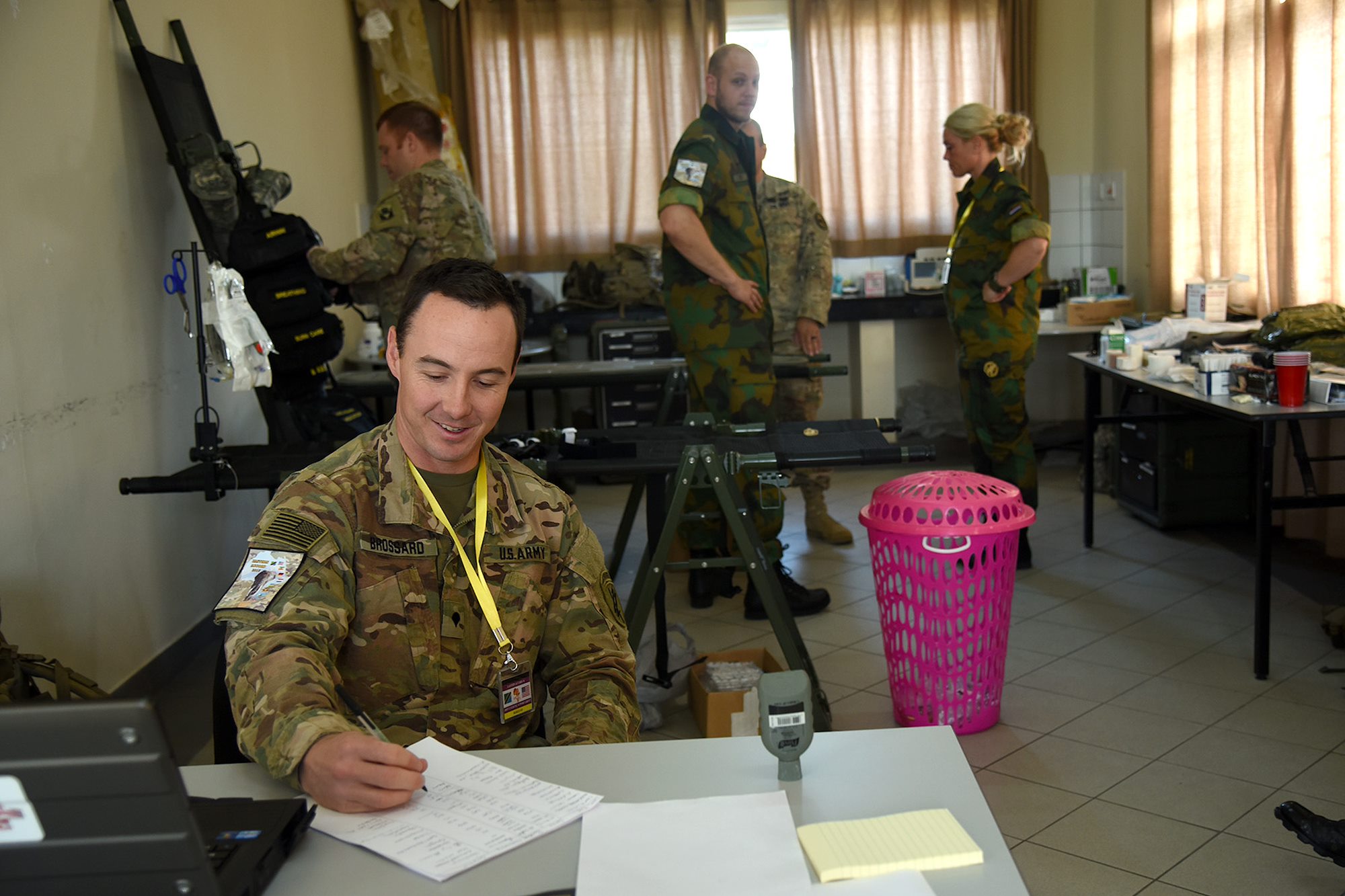 DAR ES SALAAM, Tanzania - U.S. Army Spc. Ron Brossard, Eastern Accord 2016 medical support team medic, writes notes on the patient check in sheet at the Tanzanian Peacekeeping Training Centre, July 15, 2016, in Dar es Salaam, Tanzania. The Dutch, Ugandan and U.S. medical team supports approximately 200 personnel for the annual, combined, joint military exercise that brings together nine partner nations to practice and demonstrate proficiency in conducting peacekeeping operations. (U.S. Air Force photo by Staff Sgt. Tiffany DeNault)