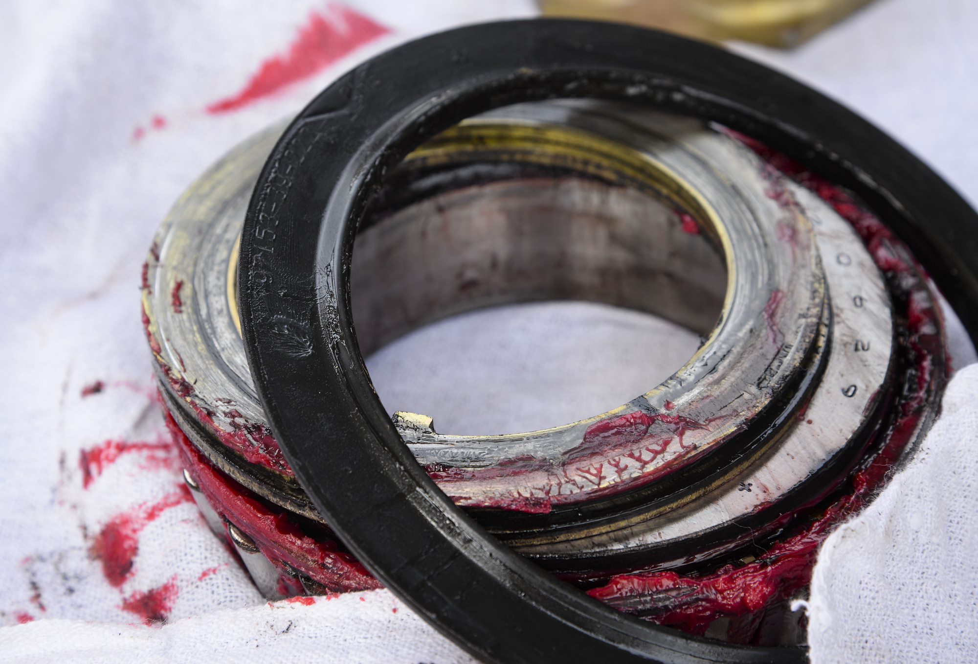 Bearings covered in red grease sit on a towel before being replaced on a C-130J Hercules during a tire change at Camp Lemonnier, Djibouti, July 18, 2016. The C-130J underwent routine maintenance to continue the mission of personnel recovery and protect and defend United States interests in Eastern Africa. (U.S. Air Force photo by Staff Sgt. Benjamin Raughton)