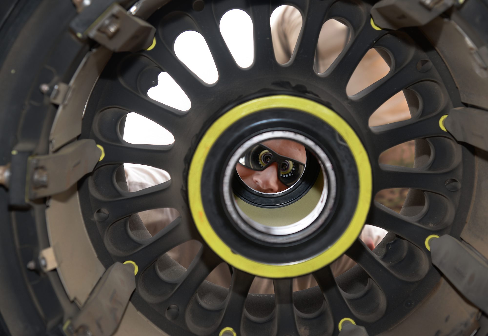 Staff Sgt. Michael Patterson, 81st Expeditionary Rescue Squadron aerospace propulsion craftsman, looks through the center of a C-130J Hercules main landing gear at Camp Lemonnier, Djibouti, July 18, 2016. The C-130J underwent routine maintenance to continue the mission of personnel recovery and protect and defend United States interests in Eastern Africa. (U.S. Air Force photo by Staff Sgt. Benjamin Raughton)