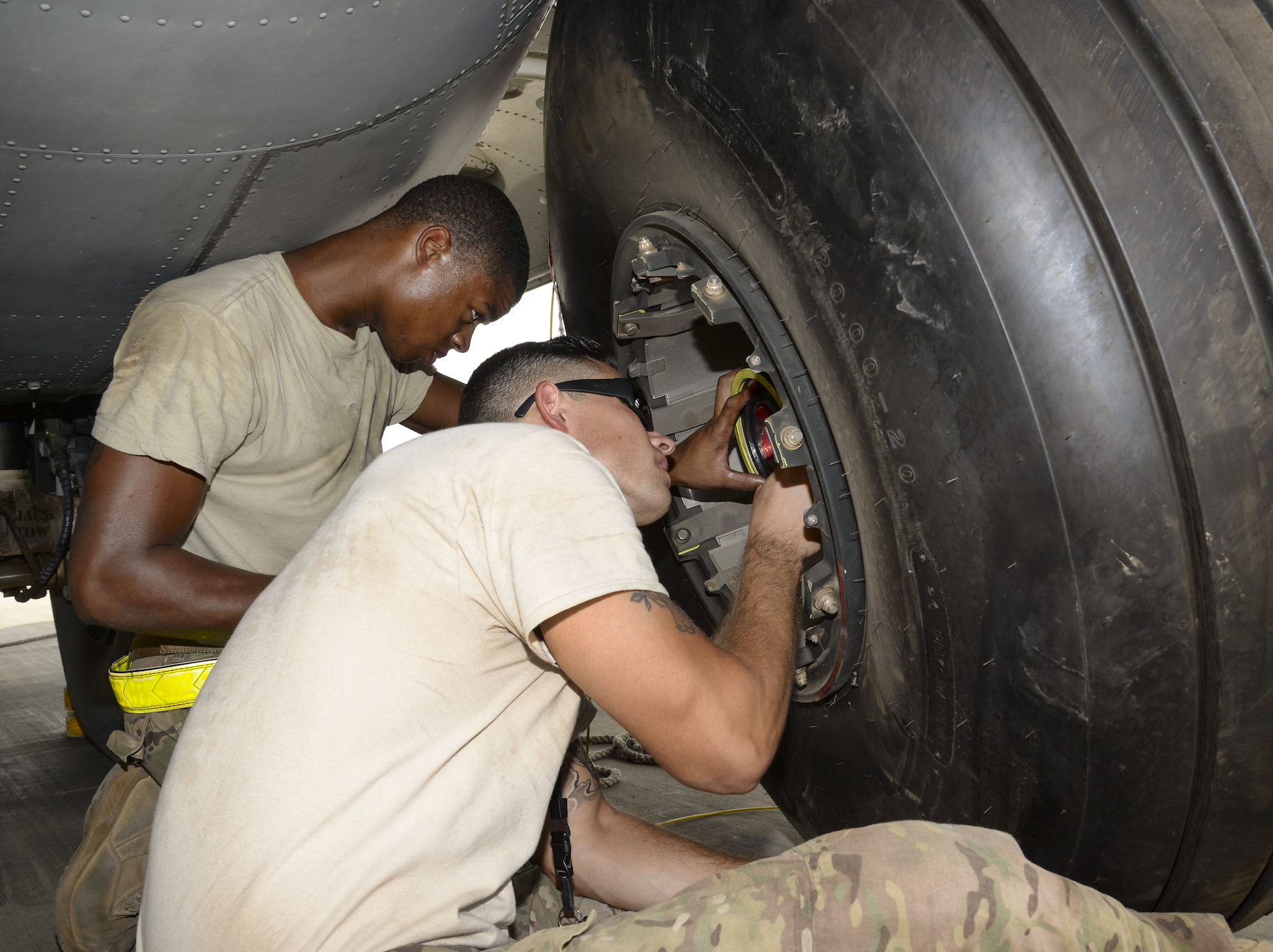 Senior Airman Tavaris Scott, 81st Expeditionary Rescue Squadron crew chief, left, and Staff Sgt. Michael Patterson, 81st ERQS aerospace propulsion craftsman, team up to change a tire on a C-130J Hercules main landing gear at Camp Lemonnier, Djibouti, July 18, 2016. The C-130J underwent routine maintenance to continue the mission of personnel recovery and protect and defend United States interests in Eastern Africa. (U.S. Air Force photo by Staff Sgt. Benjamin Raughton)