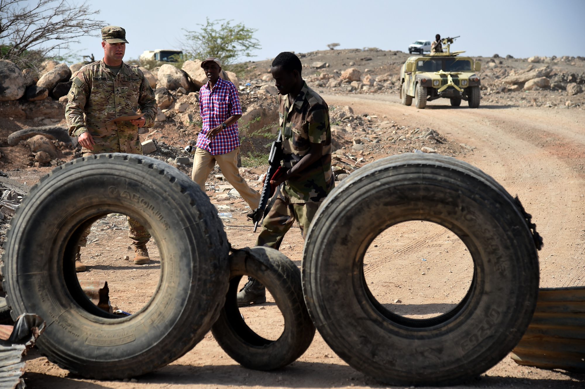 CAMP CHEIK OSMAN, Djibouti – U.S. Army Staff Sgt. Richard Keaton, U.S. Army Regionally Aligned Forces instructor, tests a Djiboutian Armed Forces (FAD) soldier on identifying a mock roadside bomb during a road block test, May 16, 2016, at Camp Cheik Osman, Djibouti. The USARAF spent approximately five months with FAD soldiers training them on various combat skills from medical care, rifle marksmanship, improvised explosive device recognition, convoy procedures and more. (U.S. Air Force photo by Staff Sgt. Tiffany DeNault)