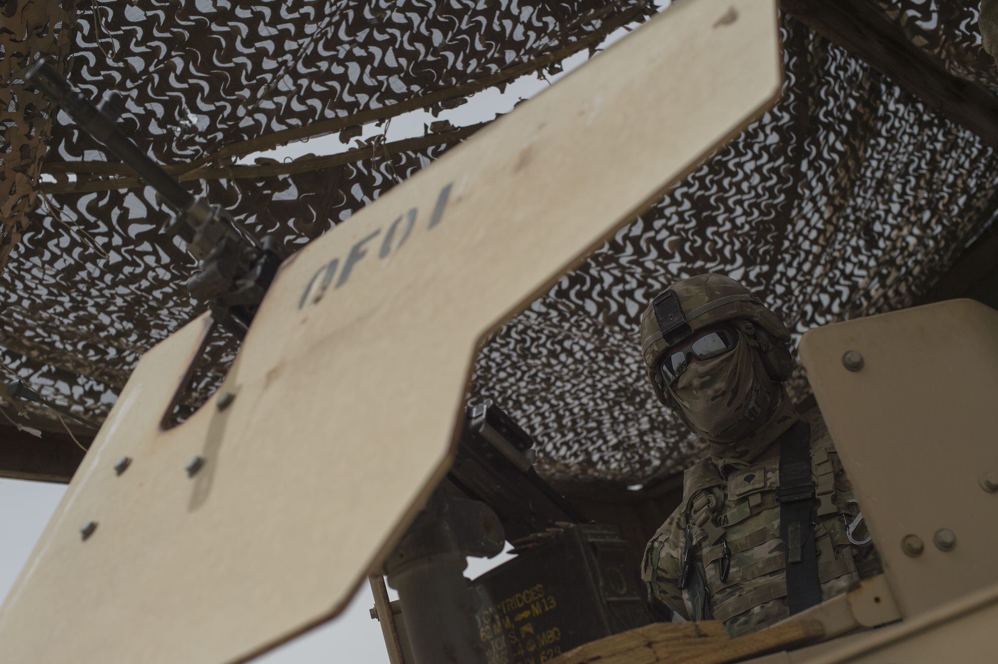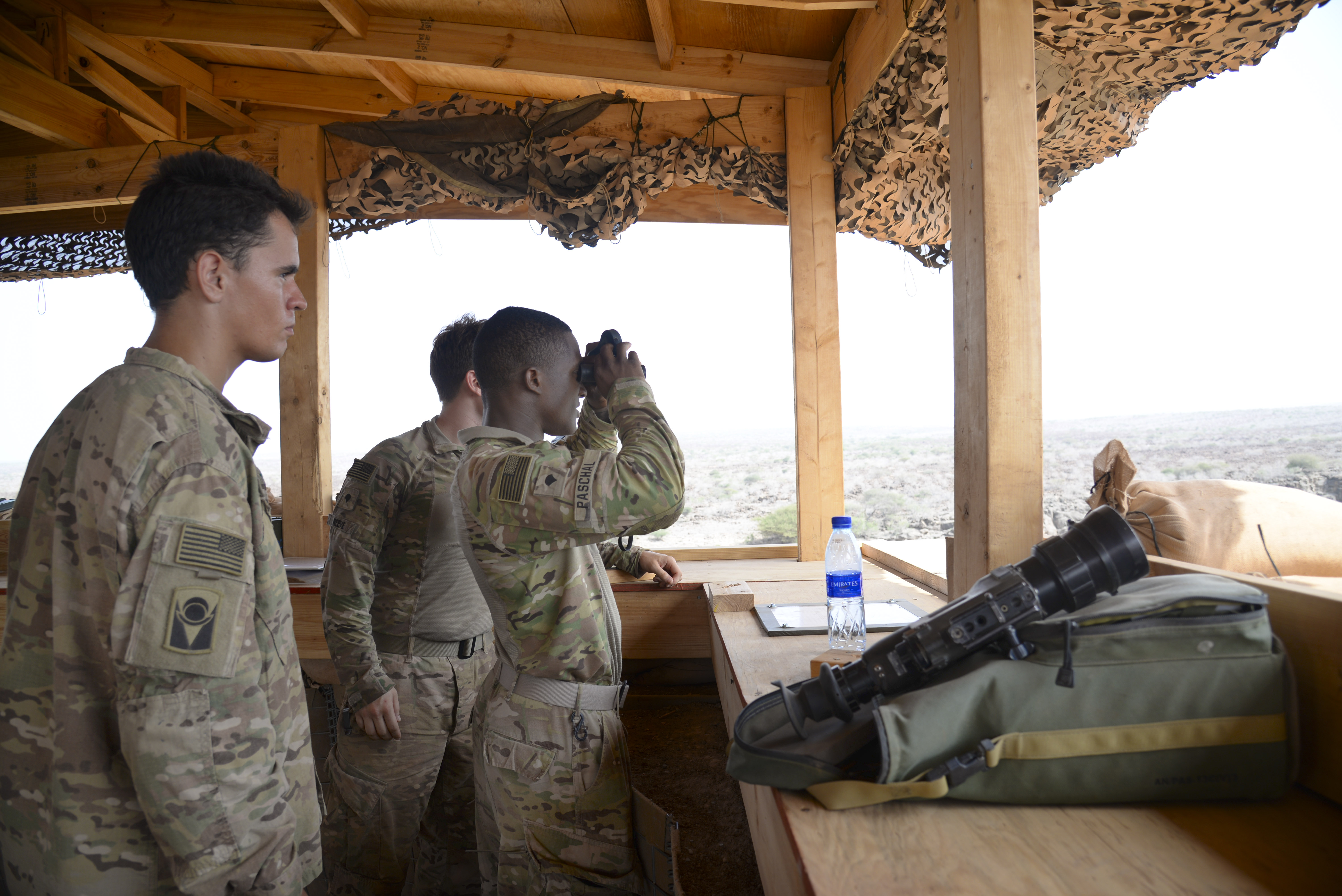 U.S. Army soldiers with B Troop, 1st Squadron, 153rd Cavalry Regiment, conduct surveillance May 21, 2016. Task Force Seminole’s defensive fighting positions have significantly improved over the course of their 11-month deployment, but they didn’t do the work alone. Units from the U.S. Navy, Marine Corps and Air Force worked together to help accomplish the airfield’s mission of enabling air operations in support of three U.S. combatant commands. (U.S. Air Force photo by Senior Airman Benjamin Raughton/Released)