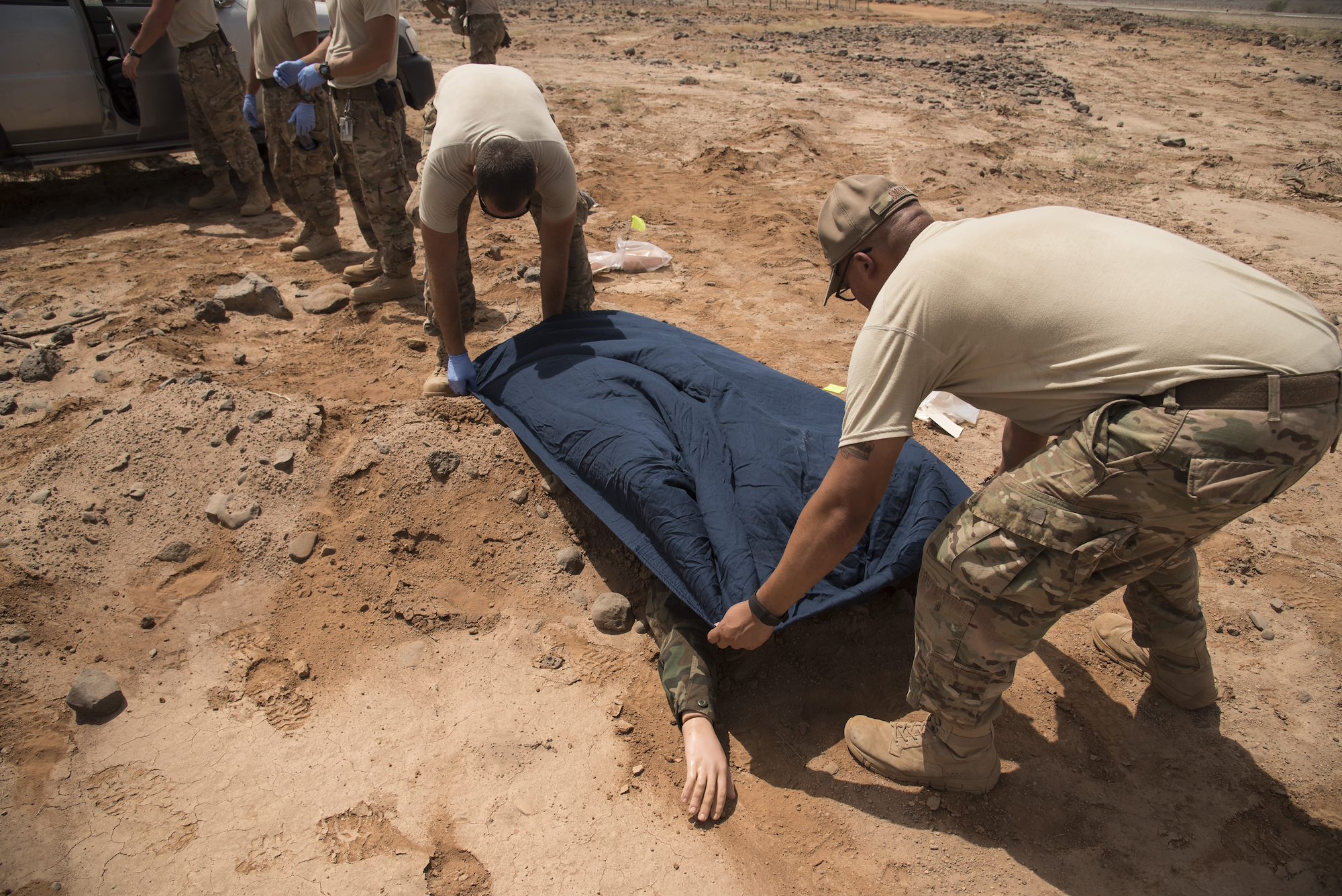 DJIBOUTI- U.S. Air Force 1st Lt. Everett Karpauskas and Tech. Sgt. Anthony Smith, 870th Air Expeditionary Squadron, cover a mock casualty during a mass casualty exercise, June 1, 2016, at a nearby airfield. Services personnel from the 870th Air Expeditionary Squadron, along with volunteers from the U.S. Navy, Marine Corps, Army and Air Force, test their skills in search and recovery and mortuary affairs collection point processes during a simulated vehicle-borne improvised explosive device explosion resulting in two casualties. (U.S. Air Force photo by Staff Sgt. Tiffany DeNault)