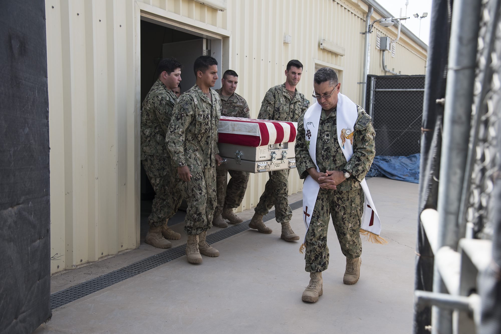 CAMP LEMONNIER, Djibouti – U.S. Navy Chaplain Cmdr. Luis Perez, Camp Lemonnier Religious Affairs command chaplain, simulates transporting human remains to the flight line with U.S. Navy mortuary affairs volunteers during a mass casualty exercise, June 1, 2016, at Camp Lemonnier, Djibouti. The exercise involved personnel from Camp Lemonnier, Combined Joint Task Force-Horn of Africa and a nearby airfield to test their skills in search and recovery, communication, coordination, and mortuary affairs collection point processes. (U.S. Air Force photo by Staff Sgt. Tiffany DeNault)