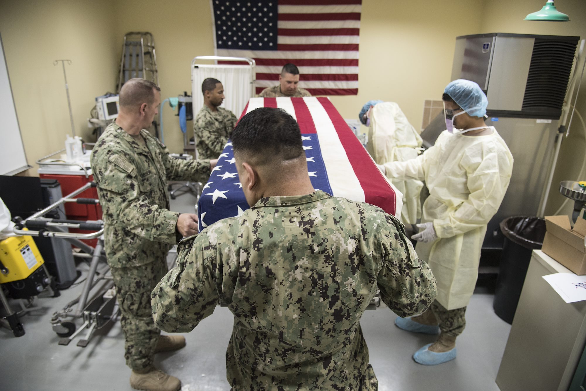 CAMP LEMONNIER, Djibouti – Volunteers from the U.S. Navy, Marine Corps, and Army, place an American Flag-dressed, temperature-controlled casket cover over mock human remains during a mass casualty exercise, June 1, 2016, at Camp Lemonnier, Djibouti. Services personnel from the 870th Air Expeditionary Squadron, along with volunteers from the U.S. Navy, Marines, Army and Air Force tested their skills in search and recovery and mortuary affairs collection point processes during a mock vehicle-borne improvised explosive device detonation resulting in two casualties. (U.S. Air Force photo by Staff Sgt. Tiffany DeNault)