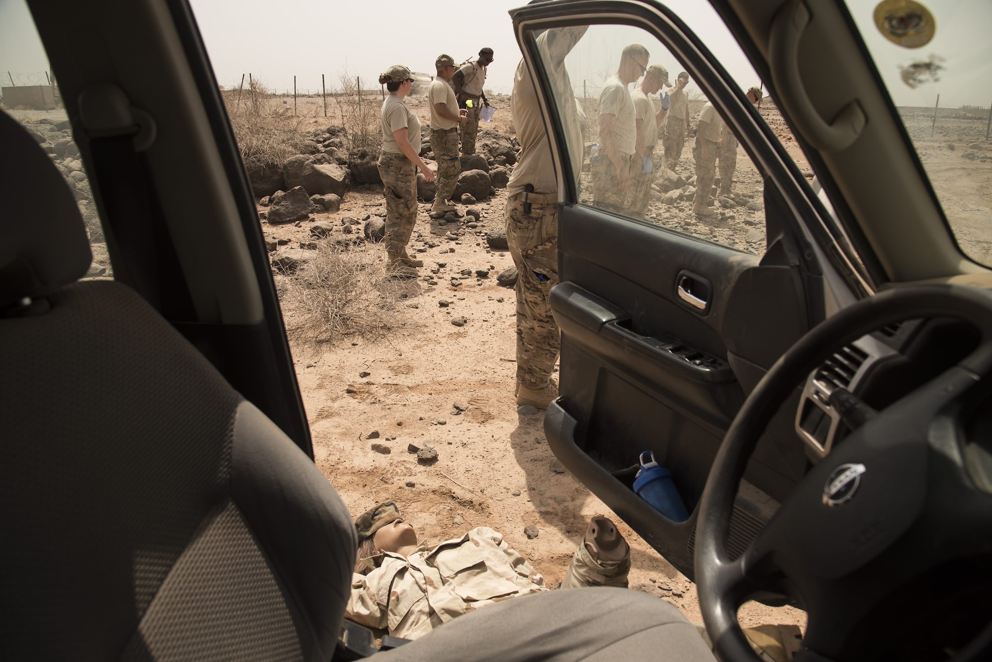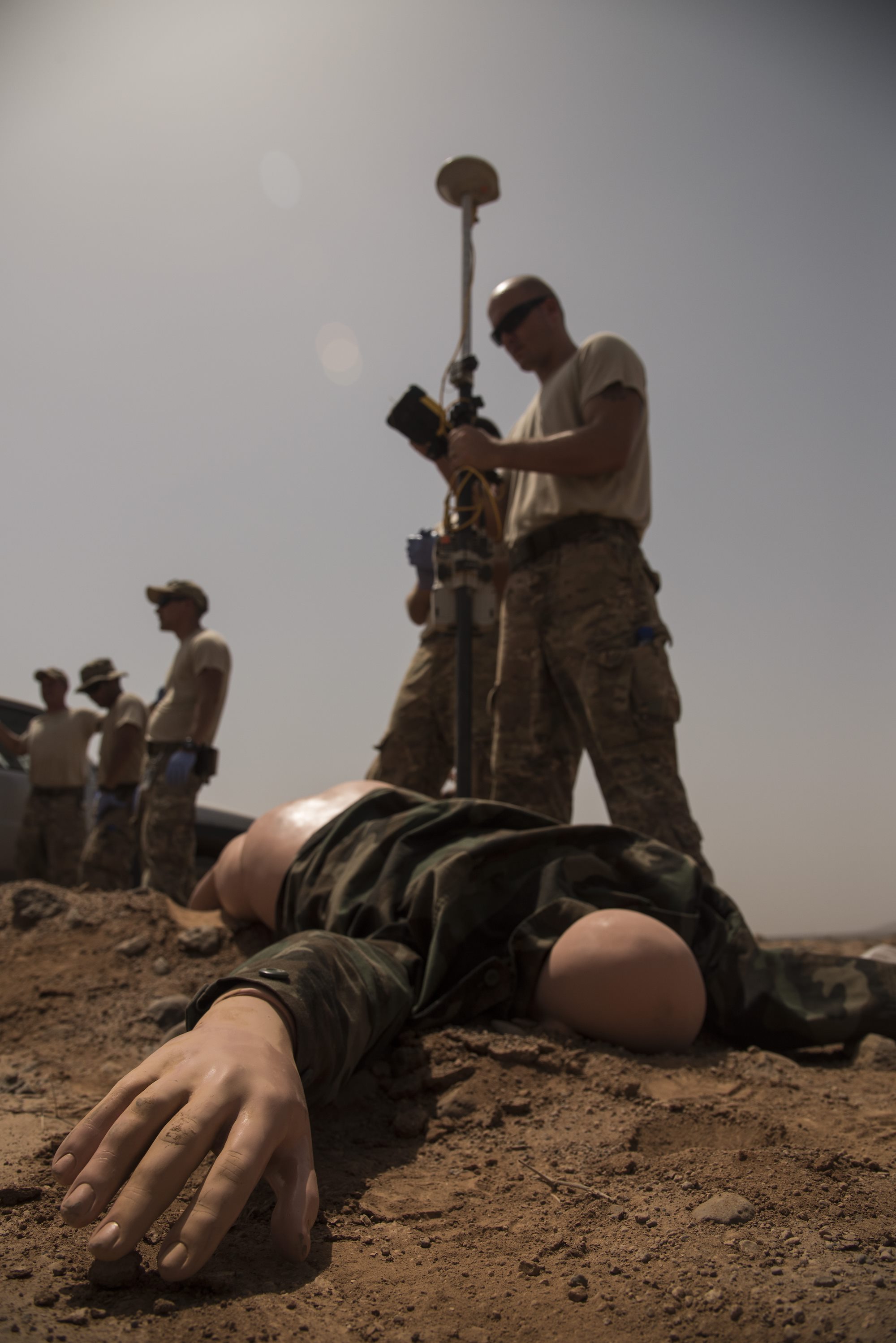 DJIBOUTI- U.S. Air Force Master Sgt. Jason McNabb, 870th Air Expeditionary Squadron Services, records the location of a mock casualty during a mass casualty exercise, June 1, 2016, at nearby airfield. The exercise involved personnel from Chabelley Airfield, Camp Lemonnier, and Combined Joint Task Force-Horn of Africa to test their skills in search and recovery, communication, coordination and mortuary affairs collection point processes. (U.S. Air Force photo by Staff Sgt. Tiffany DeNault)