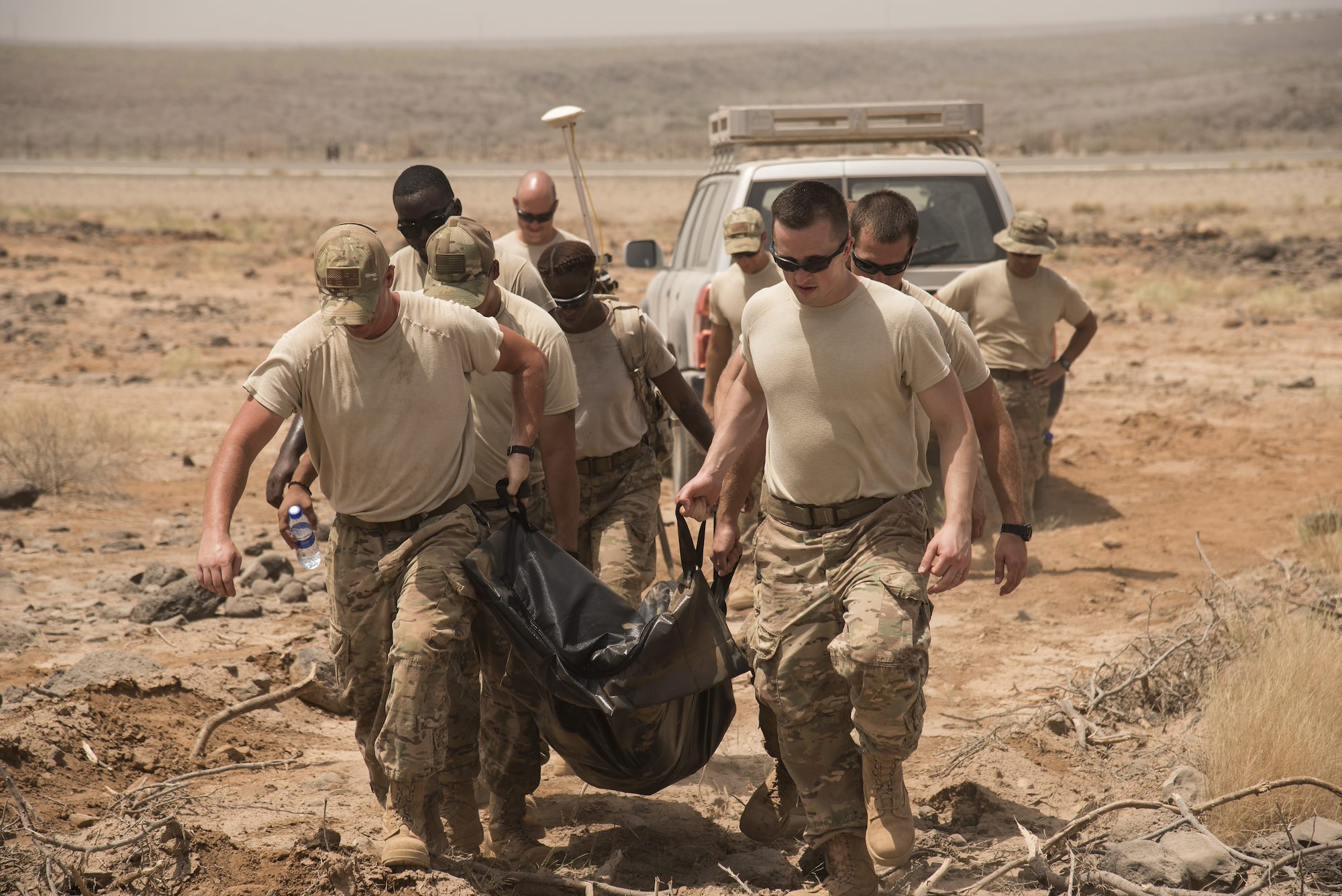 DJIBOUTI-U.S. Air Force 870th Air Expeditionary Squadron Services personnel trained in mortuary affairs, along with civil engineer volunteers, transport mock human remains from the incident scene to the mortuary affairs collection point located on Camp Lemonnier, Djibouti during a mass casualty exercise, June 1, 2016, at a nearby airfield. The exercise included mortuary affairs personnel and volunteers from the U.S. Air Force, Navy, Marine Corps and Army, testing their communication, coordination and skills in search and recovery and mortuary affairs collection point processes. (U.S. Air Force photo by Staff Sgt. Tiffany DeNault)