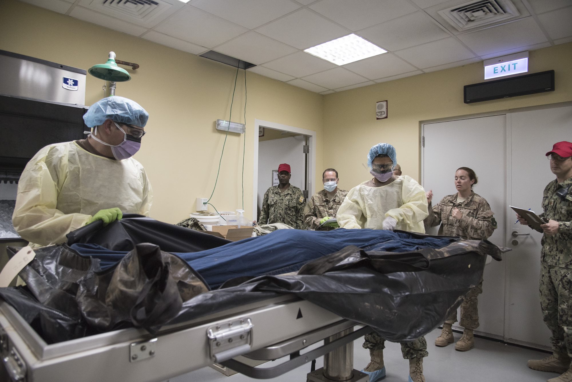 CAMP LEMONNIER, Djibouti – Volunteers from the U.S. Navy, Marines, Army and Air Force test their new skills in mortuary affairs collection point processes and procedures during a mass casualty exercise, June 1, 2016, at Camp Lemonnier, Djibouti. The exercise began at a nearby airfield when a mock vehicle-borne improvised explosive device detonated causing two casualties to test the search and recovery, communication, coordination and mortuary affairs collection point processes between Camp Lemonnier, Combined Joint Task Force-Horn of Africa and a nearby airfield personnel. (U.S. Air Force photo by Staff Sgt. Tiffany DeNault)