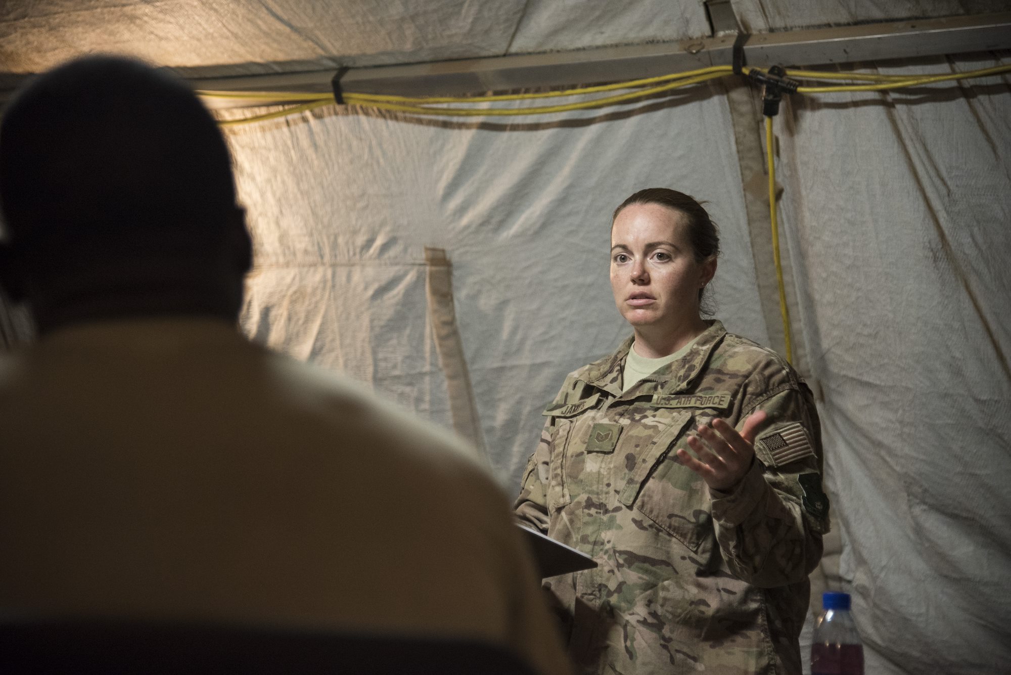 DJIBOUTI- U.S. Air Force Tech. Sgt. Kacy James, 870th Air Expeditionary Squadron Services and Mass Casualty Exercise team lead, briefs her team on the exercise scenario and search and recovery processes during a mass casualty exercise, June 1, 2016. The exercise included mortuary affairs personnel and volunteers from the U.S. Air Force, Navy, Marine Corps and Army, testing their communication, coordination, and skills in search and recovery and mortuary affairs collection point processes. (U.S. Air Force photo by Staff Sgt. Tiffany DeNault)