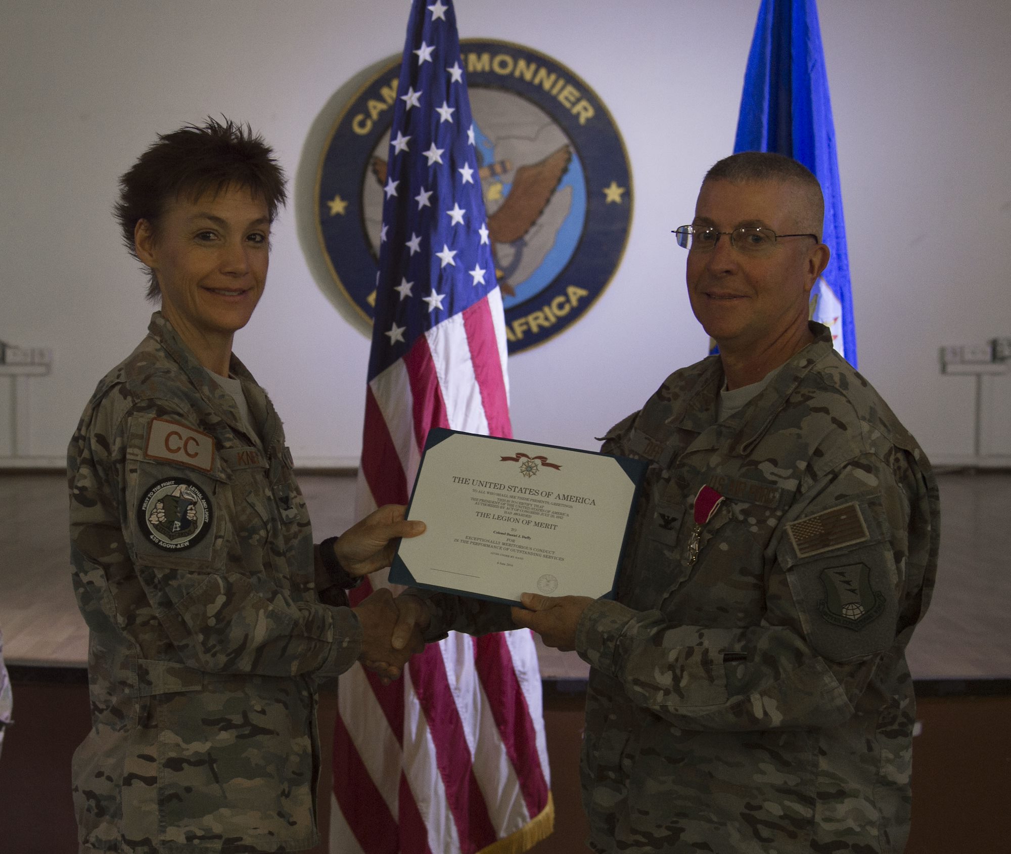 U.S. Air force Col. Andra Kniep, 435th Air Expeditionary Wing commander and presiding officer, presents a certificate for The Legion of Merit to U.S. Air Force Col. Daniel Duffy, 449th Air Expeditionary Group outgoing commander, during the 449th AEG Change of Command ceremony June 6, 2016, at Camp Lemonnier, Djibouti. The Legion of Merit is presented to a person who has distinguished themself by exceptionally meritorious conduct in the performance of outstanding services. (U.S. Air Force photo by Staff Sgt. Eric Summers Jr.)
