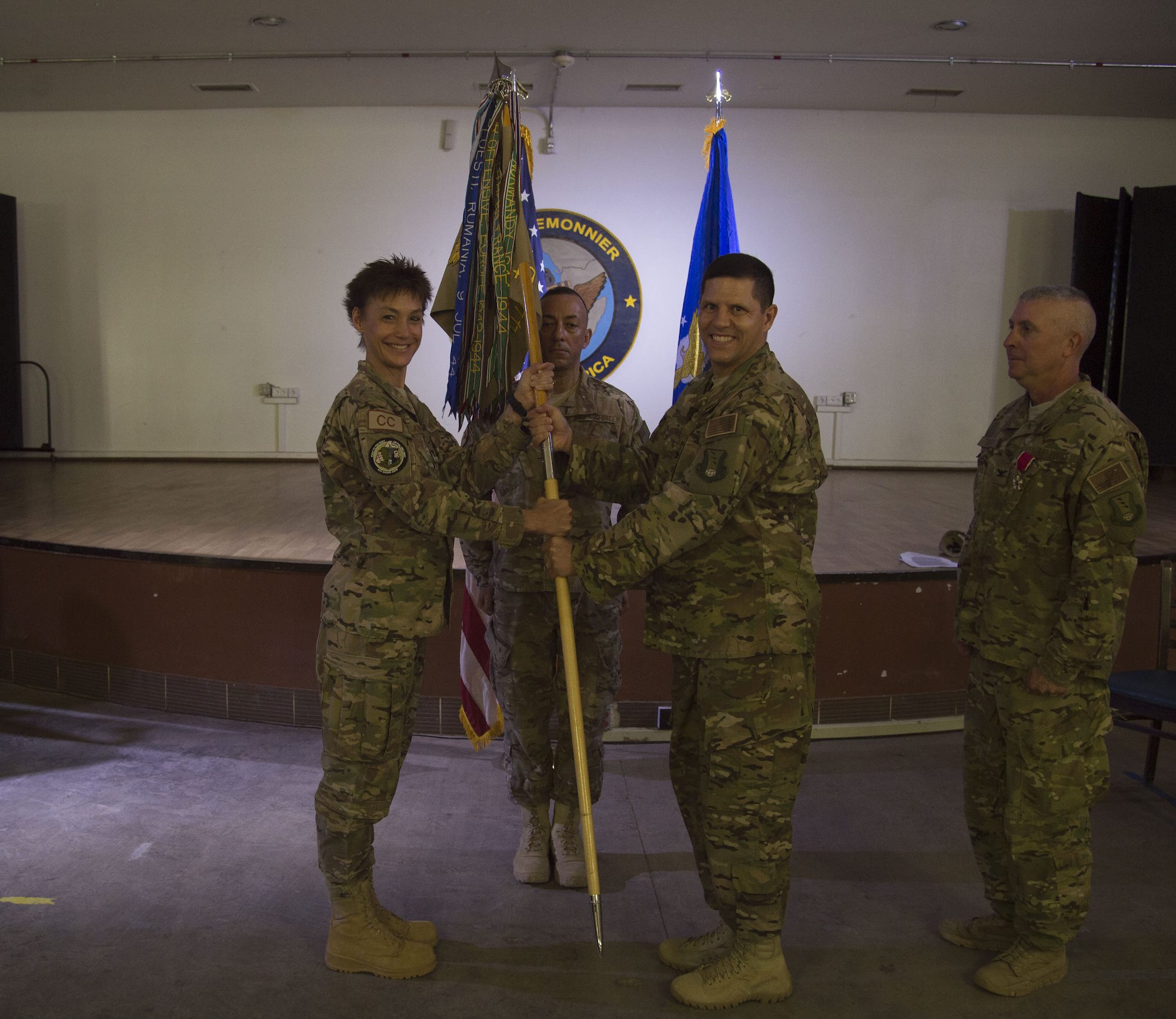 U.S. Air Force Col. Daniel Duffy, 449th Air Expeditionary Group outgoing commander, hands the 449th AEG flag to U.S. Air Force Col. Andra Kniep, 435th Air Expeditionary Wing commander, during the 449th Change of Command ceremony June 6, 2016, at Camp Lemonnier, Djibouti. The passing of the flag is a military tradition signifying the change of authority and responsibility of a unit from one commander to another. (U.S. Air Force photo by Staff Sgt. Eric Summers Jr.)