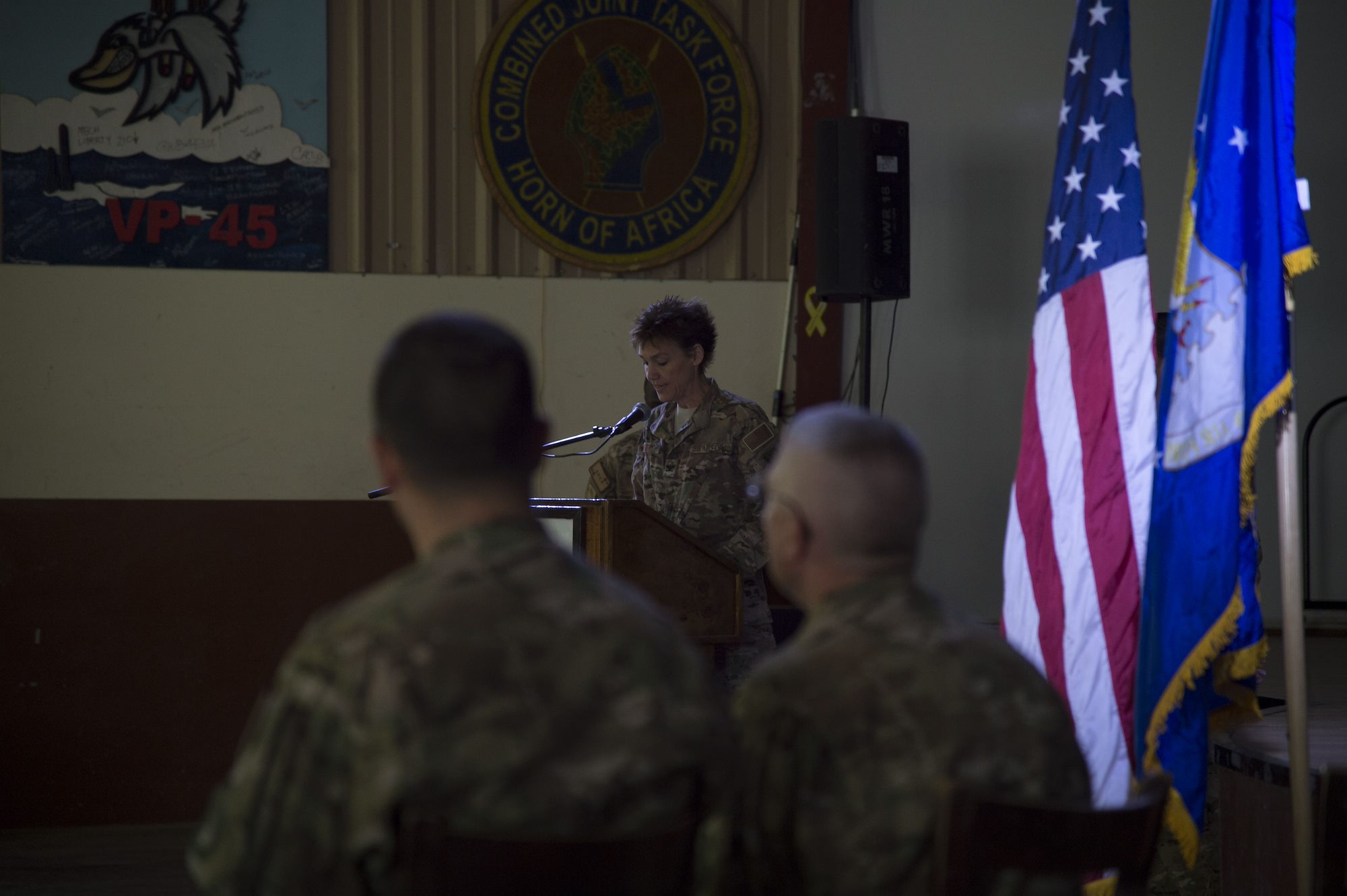 U.S. Air Force Col. Andra Kniep, 435th Air Expeditionary Wing commander and presiding officer, speaks about the achievements of U.S. Air Force Col. Daniel Duffy, 449th Air Expeditionary Group outgoing commander, during the 449th AEG Change of Command ceremony June 6, 2016, at Camp Lemonnier, Djibouti. Assigned to U.S. Forces Africa, The 449th AEG conducts personnel recovery and other operations in support of activities to enable U.S. Air Forces Africa and Combined Joint Task Force-Horn of Africa. (U.S. Air Force photo by Staff Sgt. Eric Summers Jr.)