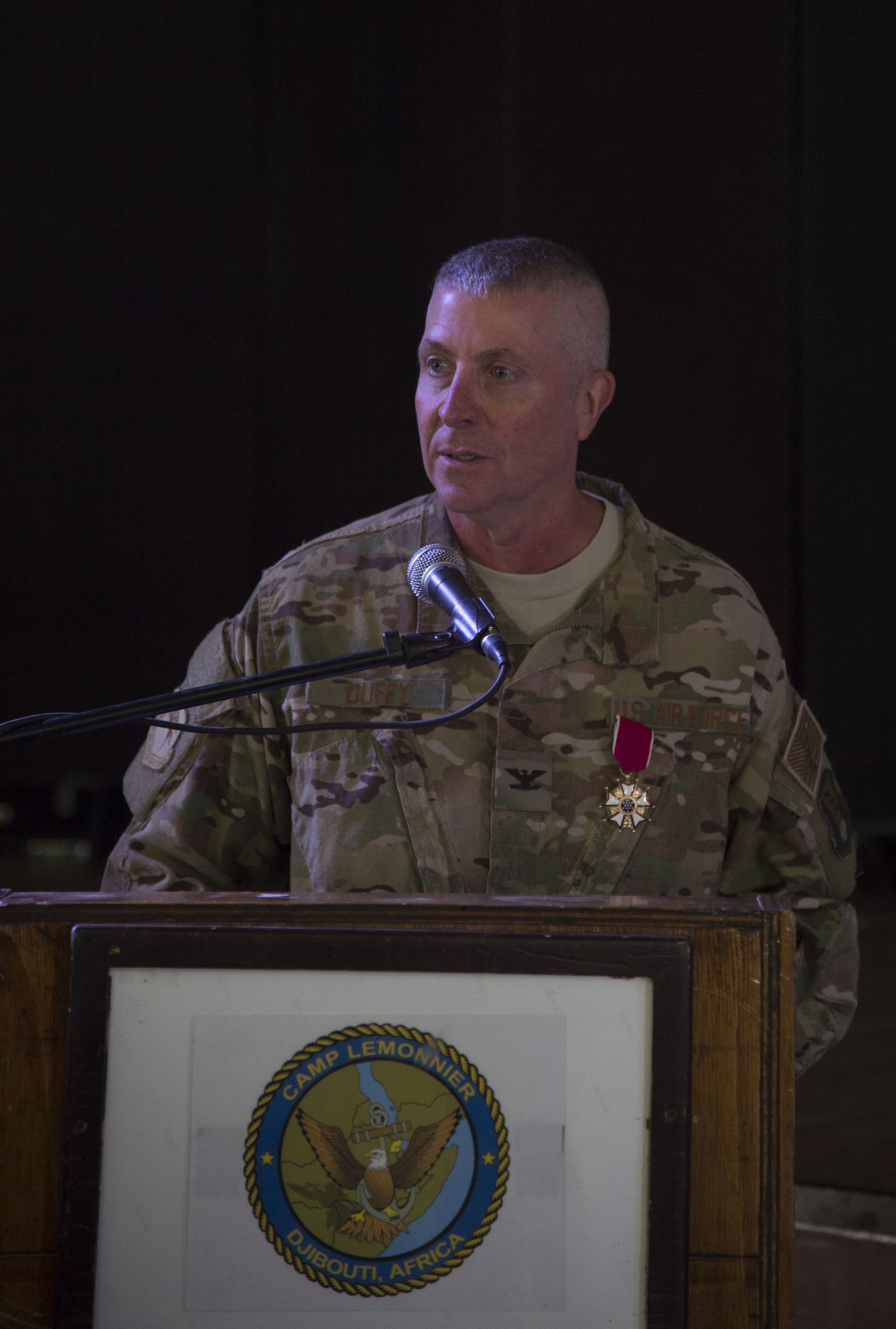 U.S. Air Force Col. Daniel Duffy, 449th Air Expeditionary Group outgoing commander, makes final remarks to the men and women of the group during the 449th AEG Change of Command ceremony June 6, 2016, at Camp Lemonnier, Djibouti. The 449th AEG is assigned to U.S. Air Forces Africa and conducts personnel recovery and other operations in support of activities for Air Forces Africa and Combined Joint Task Force-Horn of Africa. (U.S. Air Force photo by Staff Sgt. Eric Summers Jr.)