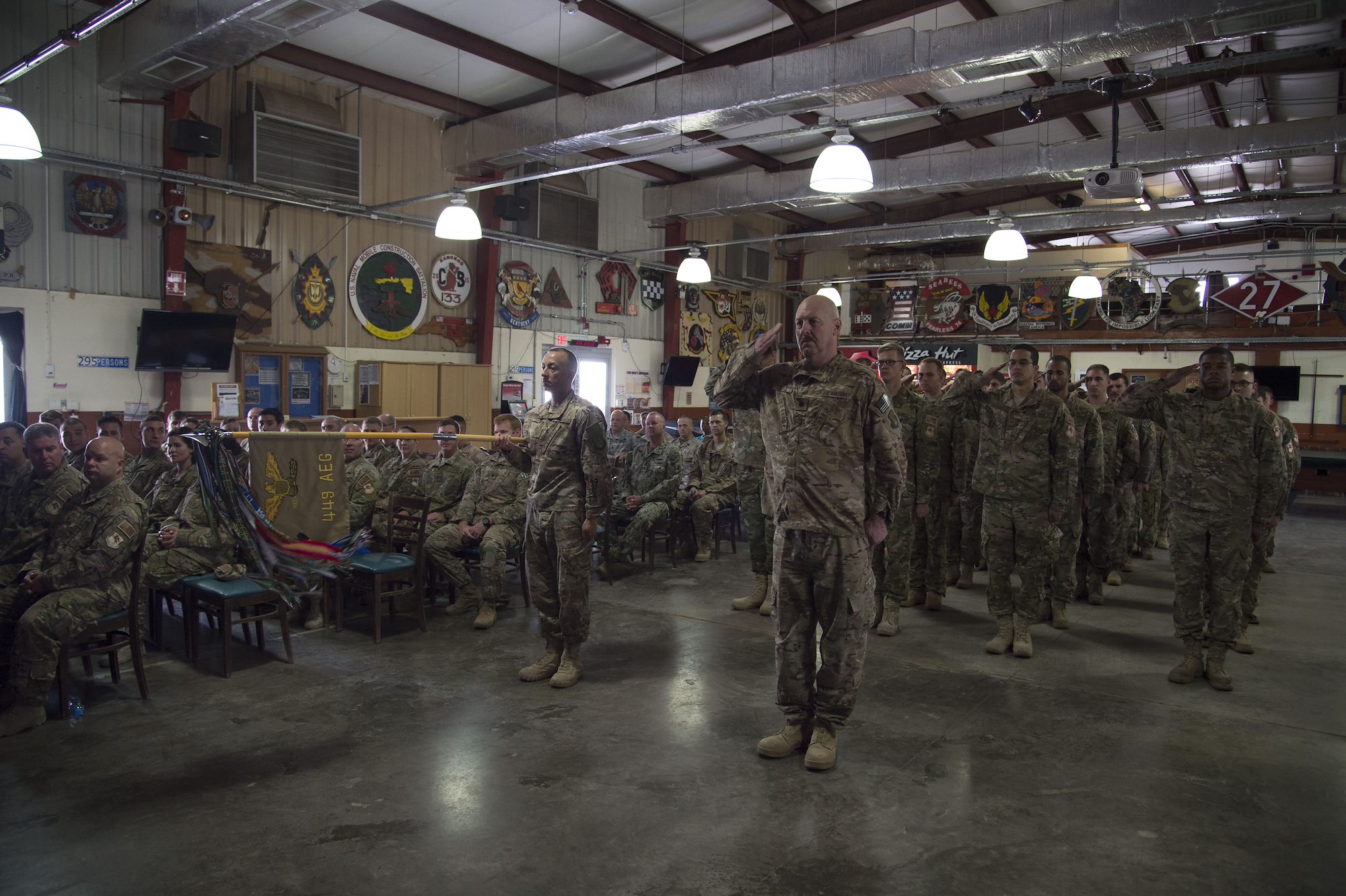 U.S. Airmen of the 449th Air Expeditionary Group salute U.S. Air Force Col. Michael Bruzzini, 449th AEG’s incoming commander, during a change of command ceremony June 6, 2016, at Camp Lemonnier, Djibouti. The first salute is a sign of respect and acknowledgement rendered to new leadership during such ceremonies. (U.S. Air Force photo by Staff Sgt. Eric Summers Jr.)