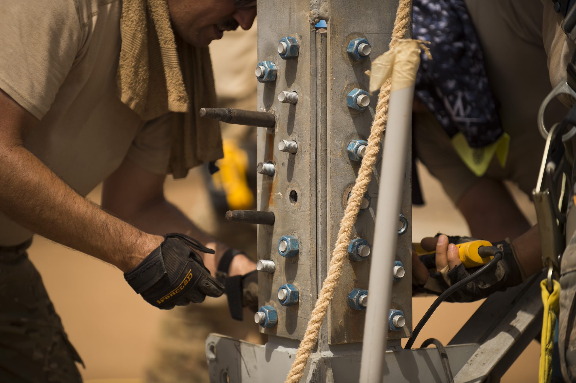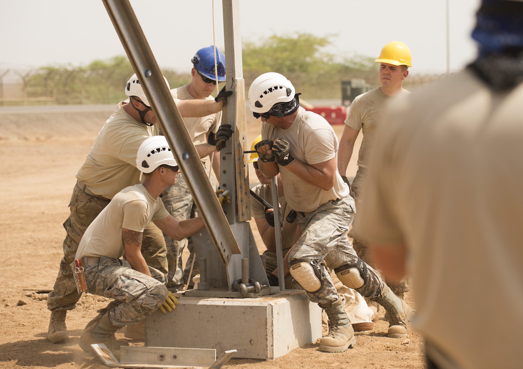 CAMP LEMONNIER, Djibouti- U.S. Air Force Airmen of the 205th Engineering Installation Squadron, out of Oklahoma City, line up pieces of the metal frame during construction of an AN/GPN-27 Airport Surveillance Radar System tower, May 26, 2016, at Camp Lemonnier, Djibouti. The new radar is a more permanent replacement for the short-term radar currently in operation. (U.S. Air Force photo by Staff Sgt. Tiffany DeNault)