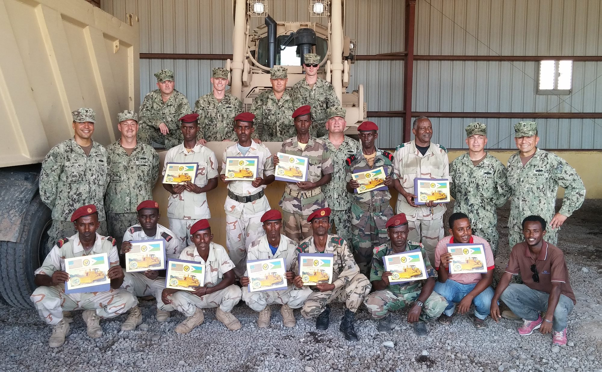 Camp Lemonnier , Djibouti (May 12, 2015) U.S. Navy Seabees of Naval Mobile Construction Battalion (NMCB) 14 pose with members of the Djiboutian Army’s Construction Engineers in front of new D7 Dozers after an awards ceremony at the close of a U.S. Army-led training evolution. NMCB-14 Detachment HOA is deployed to Camp Lemonnier in support of Combined Joint Task Force – Horn of Africa. (U.S. Navy photo by Chief Petty Officer Ellery Sayre)