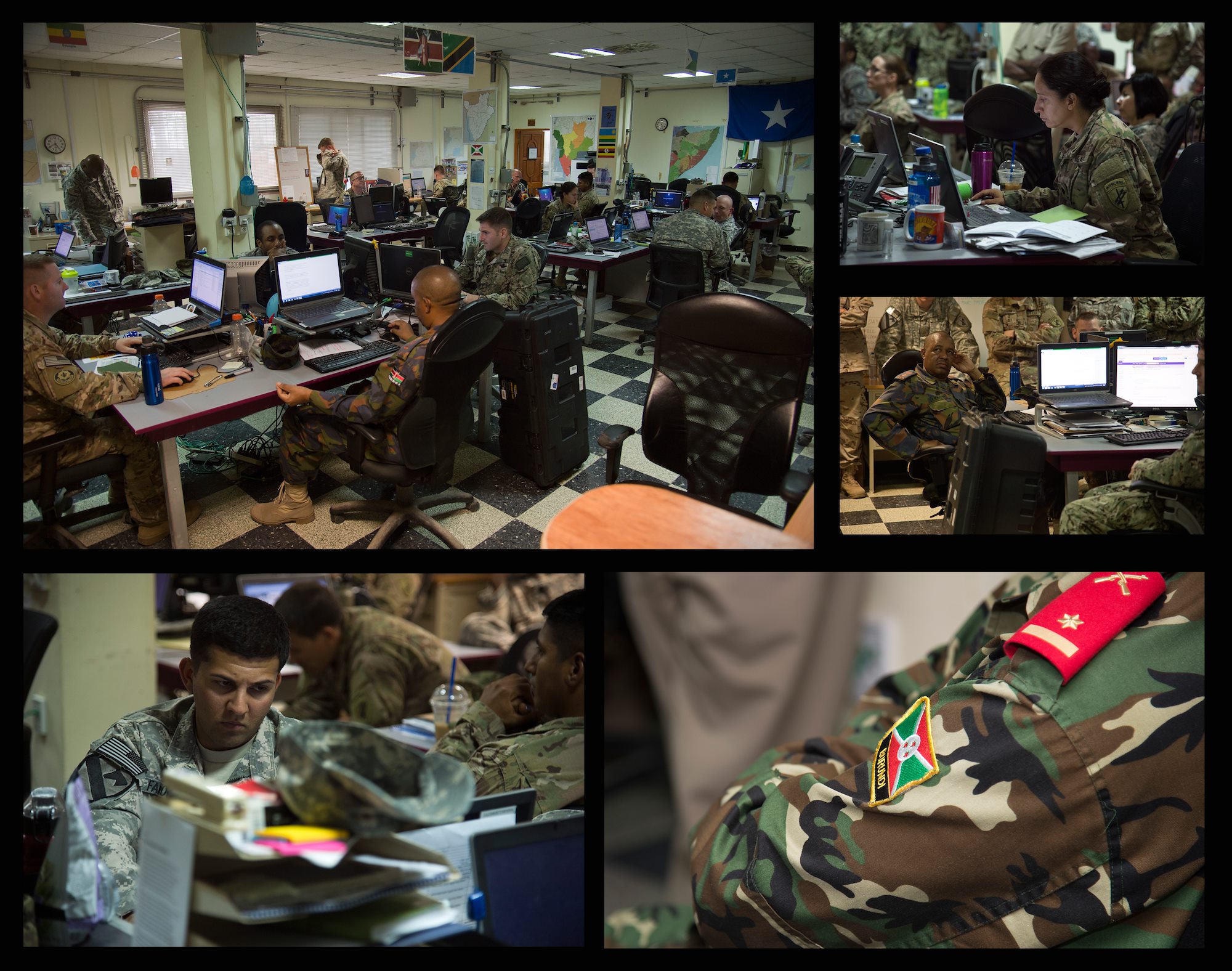 The Combined Joint Task Force-Horn of Africa Fusion Action Cell is comprised of service members from the U.S., Europe and East Africa working together to setup military-to-military projects and civilian support initiatives in partner countries throughout the Horn of Africa. The FAC personnel are separated into country desks composed of subject matter experts and foreign liaison officers who are responsible for streamlining the planning and coordination of projects in their respective country. (U.S. Air Force graphic by Staff Sgt. Nathan Maysonet)