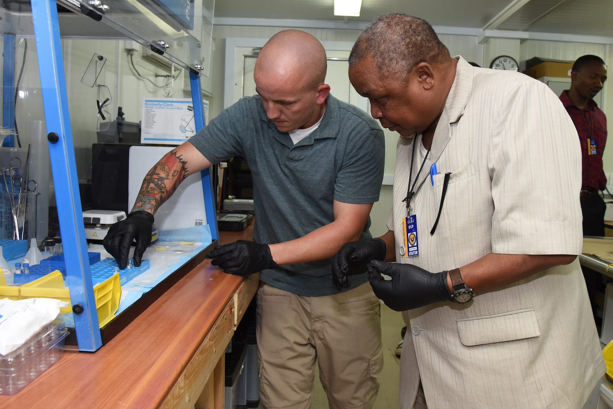 U.S. Army Staff Sgt. Walter Duncan (left), Joint Theater Forensic Analysis Center case manager, demonstrates how to set up samples for the Gas Chromatography Mass Spectrometry to Tanzania Defense Force Col. Abulrasul Ali Fupi, during a forensics briefing at Camp Lemonnier, Djibouti, June 23, 2015. The JTFAC team uses GC/MS to identify different substances within a test sample. It can be used to aid with drug detection, fire investigation, explosives investigation, and identification of unknown samples. (U.S. Air Force photo by Staff Sgt. Maria Bowman)
