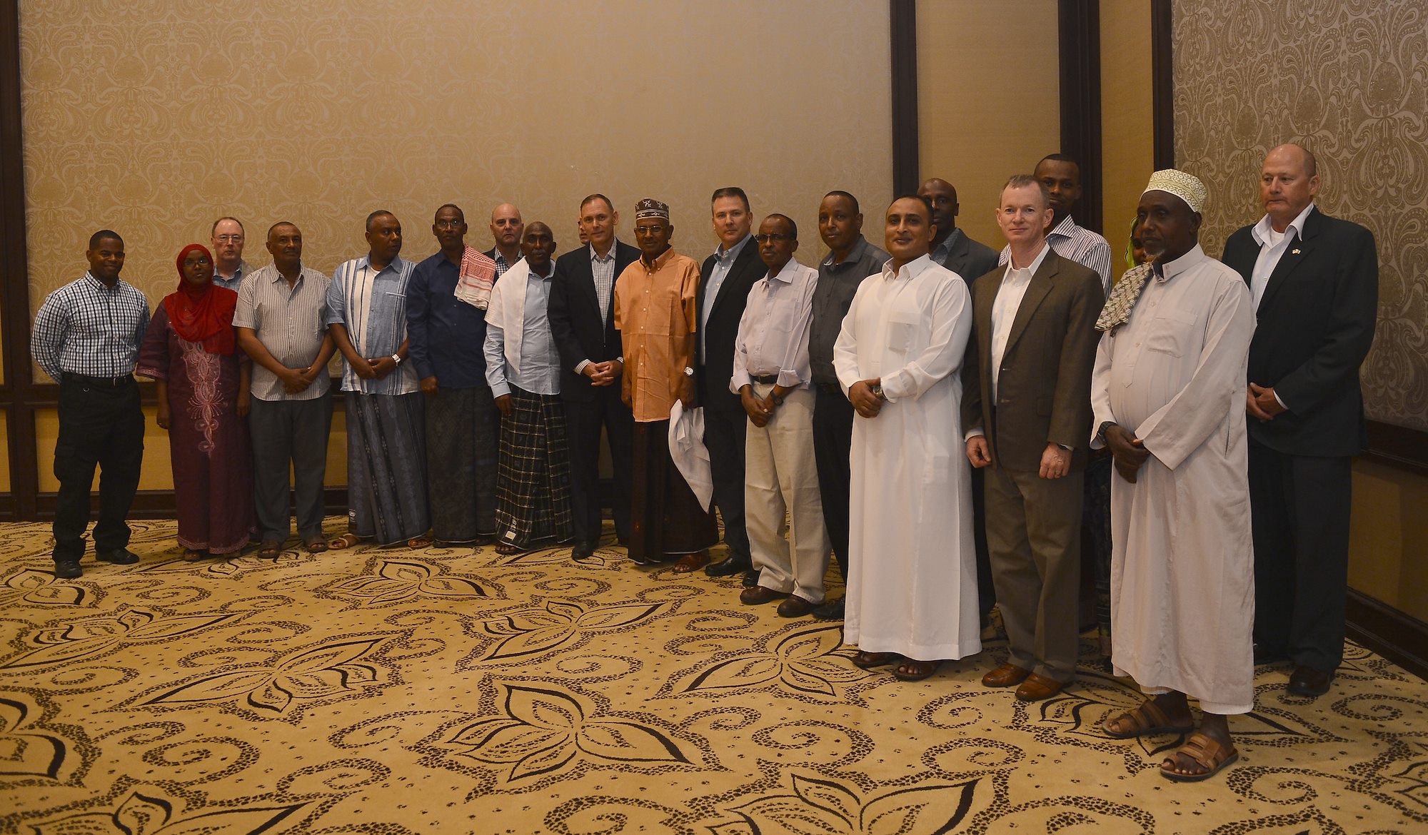 Combined Joint Task Force-Horn of Africa’s Iftar dinner attendees pose for a group photo at the Kempinski Hotel, Djibouti, June 29, 2015. CJTF-HOA, Camp Lemonnier, and U.S. Embassy leaders gathered together with Djiboutian military leaders and their families in honor of Ramadan. (U.S. Air Force photo by Senior Airman Nesha Humes)