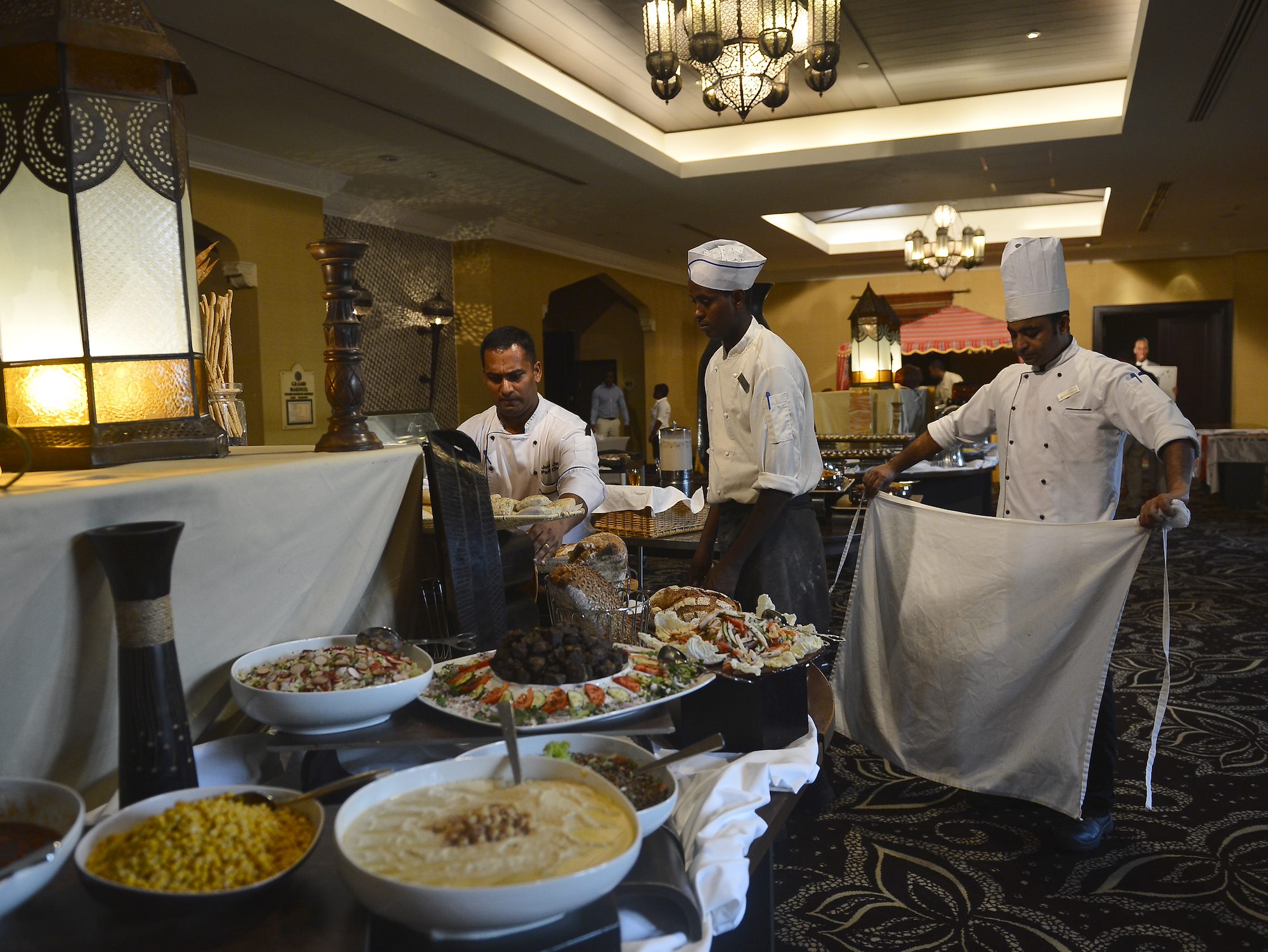 Kempinski Hotel caterers set up for Combined Joint Task Force-Horn of Africa’s Iftar dinner in Djibouti, June 29, 2015. Iftar is the fast-breaking meal during the Muslim religious observance of Ramadan. (U.S. Air Force photo by Senior Airman Nesha Humes)