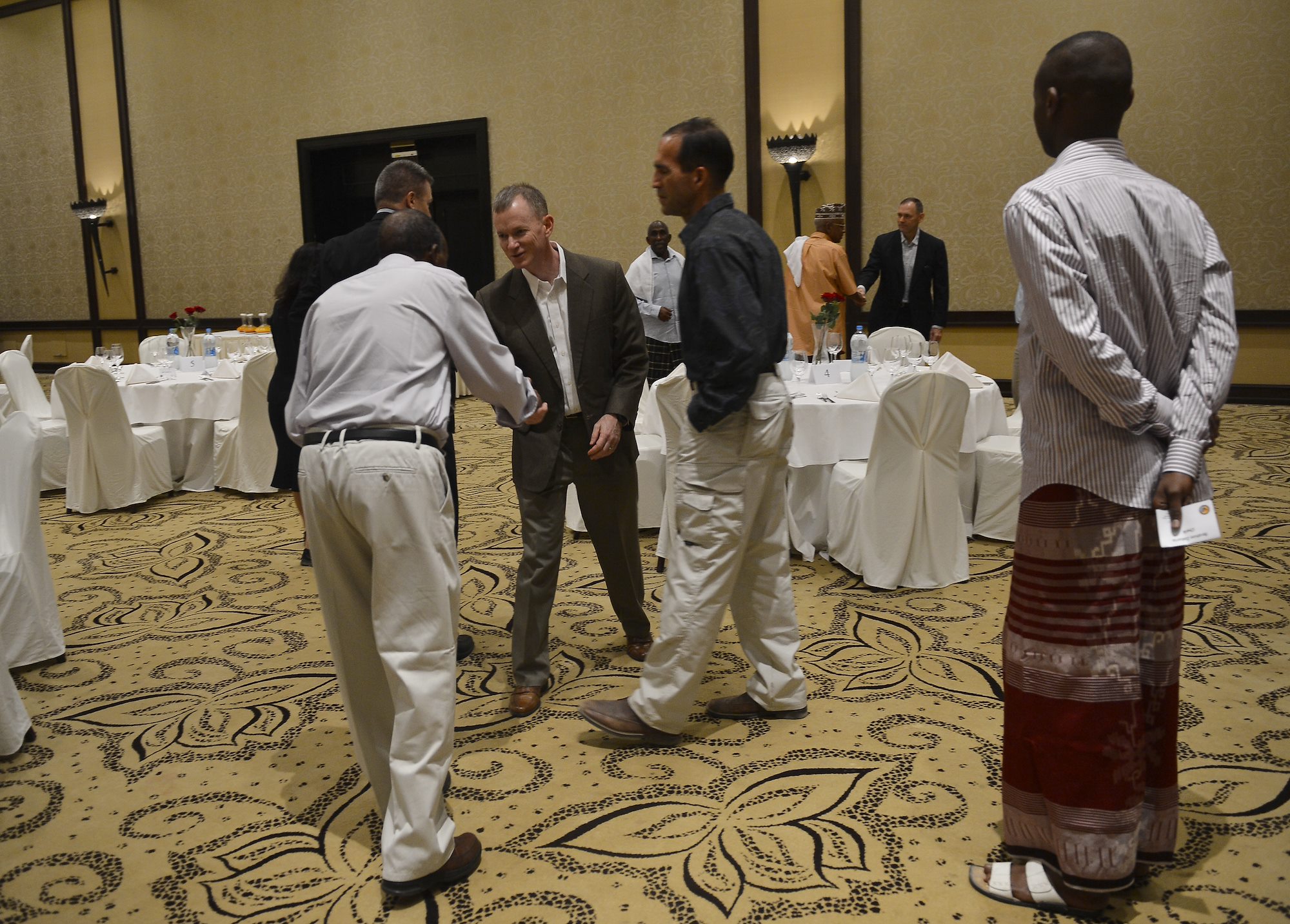 U.S. Air Force Brig. Gen. William P. West, Combined Joint Task Force-Horn of Africa deputy commander, greets Iftar dinner guests at the Kempinski Hotel, Djibouti, June 29, 2015. Since 2006, CJTF-HOA, Camp Lemonnier, and U.S. Embassy leaders have gathered with Djiboutian military leaders and their families for the annual celebration of the month-long Ramadan fasting. (U.S. Air Force photo by Senior Airman Nesha Humes)