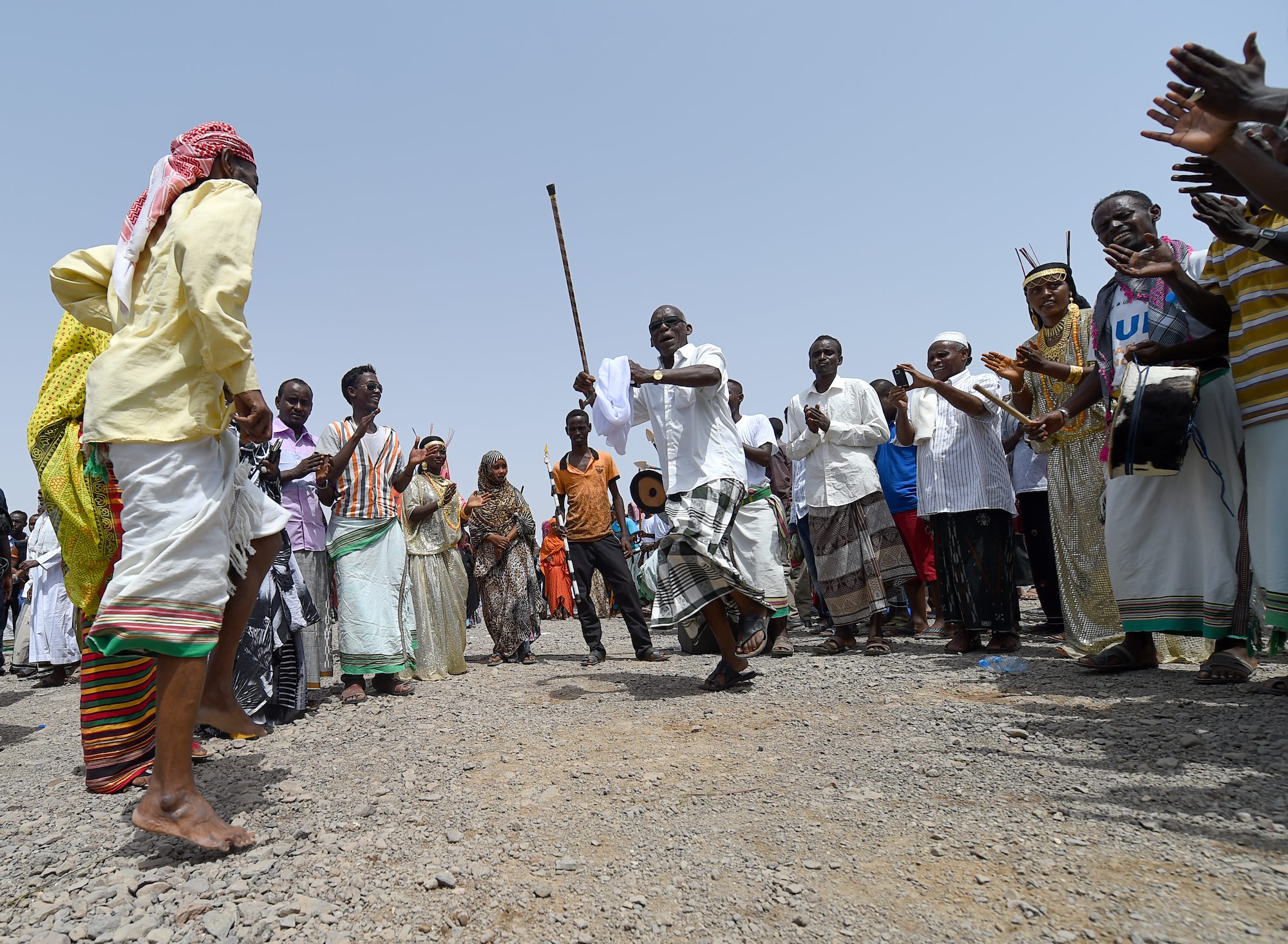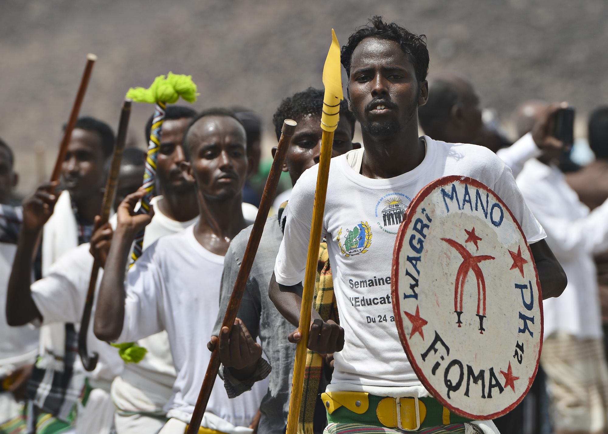 Issa tribesmen members perform a cultural dance during the 21st Induction Ceremony of the Sultan of Gobaad in Dikhil, Djibouti, May 22, 2015. Issa is one of two main ethnic groups in Djibouti. (U.S. Air Force photo by Senior Airman Nesha Humes)