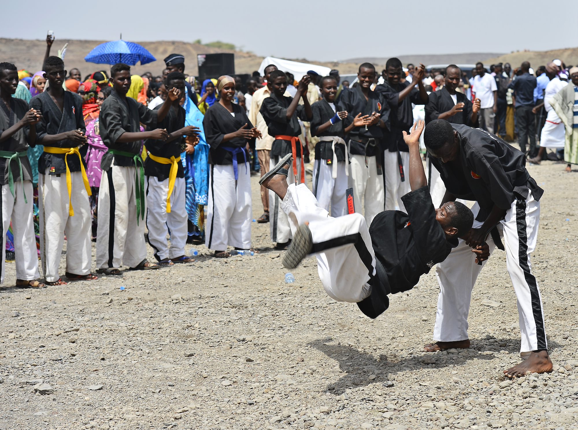 Members of the Dakaïto Ryu martial arts group perform for Habib Mohamed Loita, the 21st Sultan of Gobaad, during his induction ceremony in Dikhil, Djibouti, May 22, 2015. (U.S. Air Force photo by Senior Airman Nesha Humes)