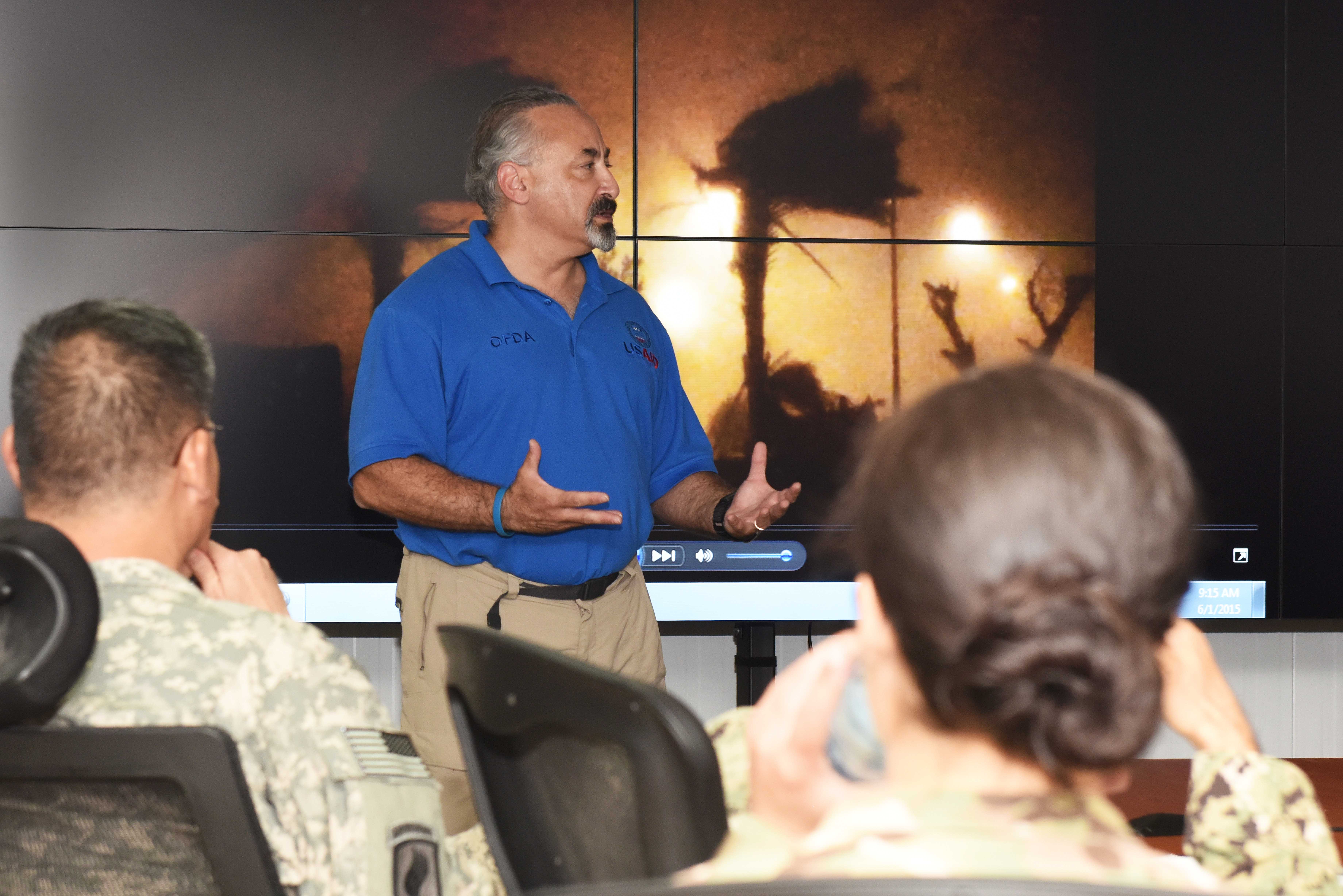 Steven Katz, Africa Command humanitarian assistance advisor instructs a joint humanitarian operations course at Camp Lemonnier, Djibouti June 1, 2015. Course attendees learned about the relationship between USAID’s Office of U.S. Foreign Disaster Assistance, its partners and the U.S. military, and learned about humanitarian assistance and disaster response operations. (U.S. Air Force photo by Staff Sgt. Maria Bowman)