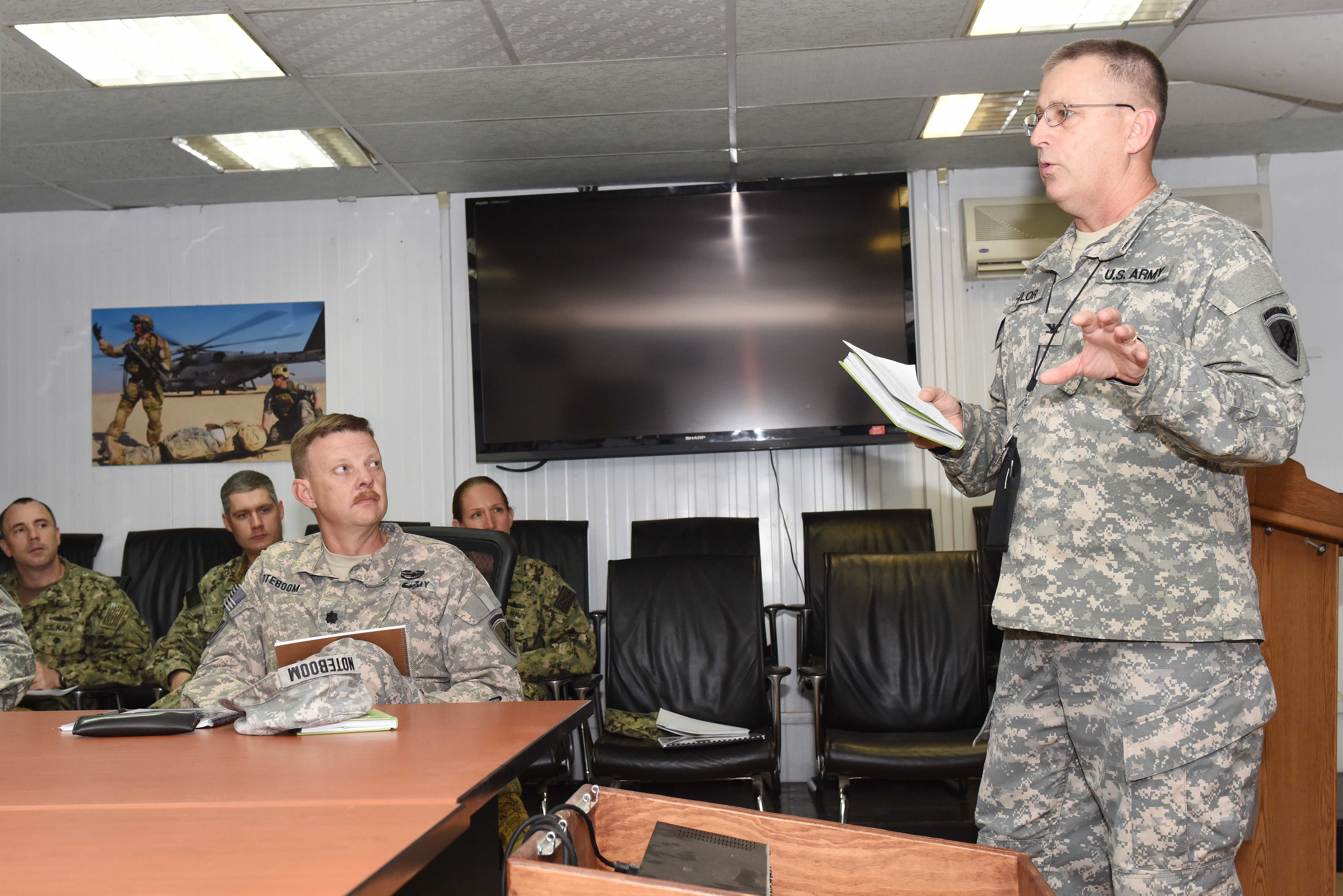 Brig. Gen. William P. West, Combined Joint Task Force- Horn of Africa deputy commander, speaks to public information officers during an African Union Mission in Somalia and Combined Joint Task Force–Horn of Africa PIO Conference at Camp Lemonnier, Djibouti, June 2, 2015. CJTF-HOA hosted the three-day conference to educate and encourage the free flow of information between AMISOM partner nations.