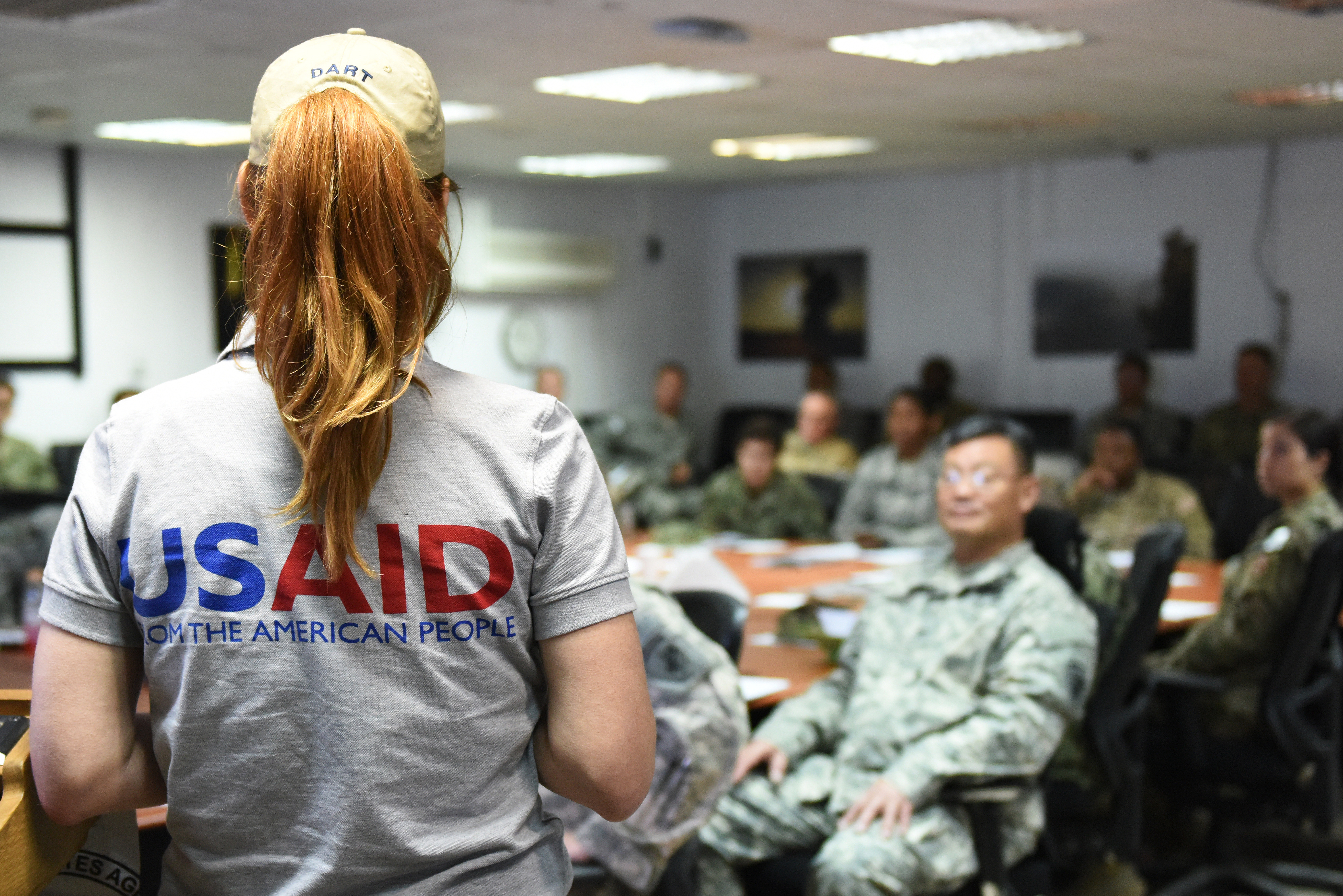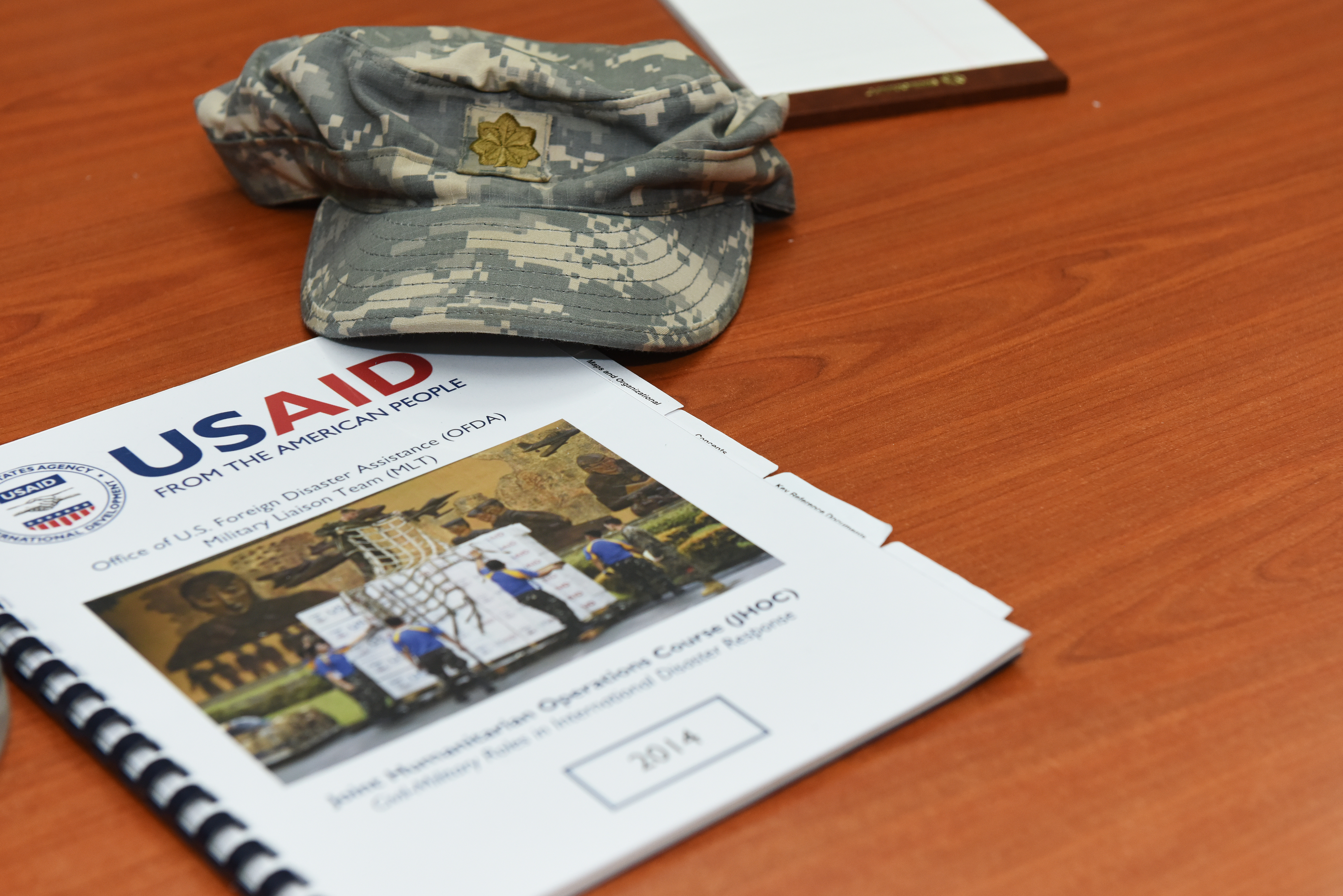 USAID’s Office of U.S. Foreign Disaster Assistance representatives led a joint humanitarian operations course at Camp Lemonnier, Djibouti, June 1, 2015. The course taught the international disaster response system, along with the roles and responsibilities of the U.S. civilian and military entities. (U.S. Air Force photo by Staff Sgt. Maria Bowman)