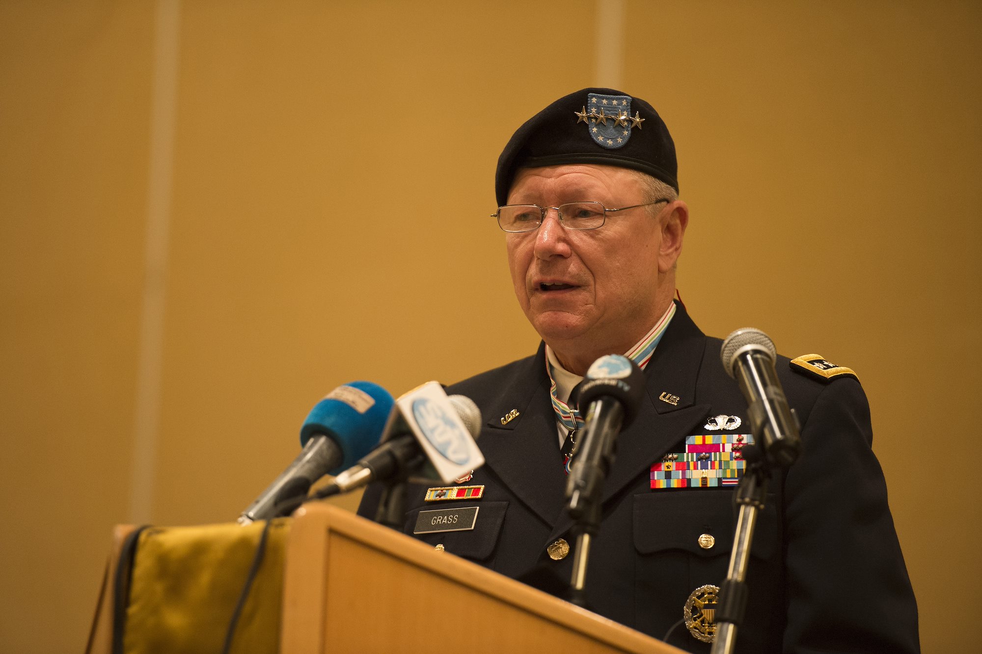 National Guard Bureau Joint Chief of Staff Gen. Frank Grass speaks at the Kentucky National Guard and the Republic of Djibouti State Partnership Program signing ceremony at the Kempinski Hotel, Djibouti, June 2, 2015. Grass spoke about the need for state’s National Guard to continue to build close and lasting personal relationships with U.S. partner nations around the world through agreements like the SPP. (U.S. Air Force photo by Staff Sgt. Nathan Maysonet)