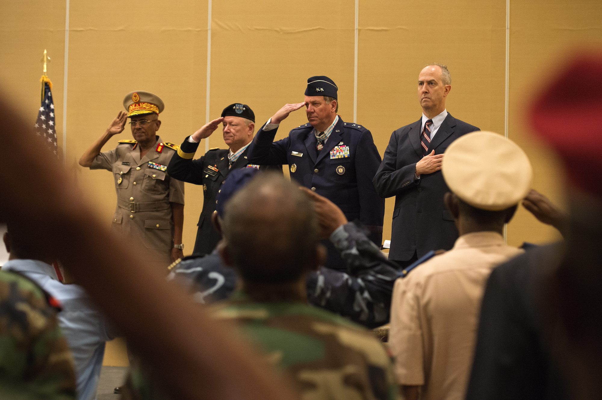 From left, Maj. Gen. Zakaria Cheik Ibrahim, Djiboutian Armed Forces chief of defense, National Guard Bureau Joint Chief of Staff Gen. Frank Grass, Maj. Gen. Edward Tonini, Kentucky National Guard adjutant general and U.S. Ambassador to Djibouti Thomas Kelly, stand during the American and Djiboutian national anthems during the Kentucky National Guard and the Republic of Djibouti State Partnership Program signing ceremony at the Kempinski Hotel, Djibouti, June 2, 2015. The SPP provides host countries with a skilled force capable of helping to train and develop the host nation’s defenses and security, disaster response, crisis management, and interagency cooperation. (U.S. Air Force photo by Staff Sgt. Nathan Maysonet)