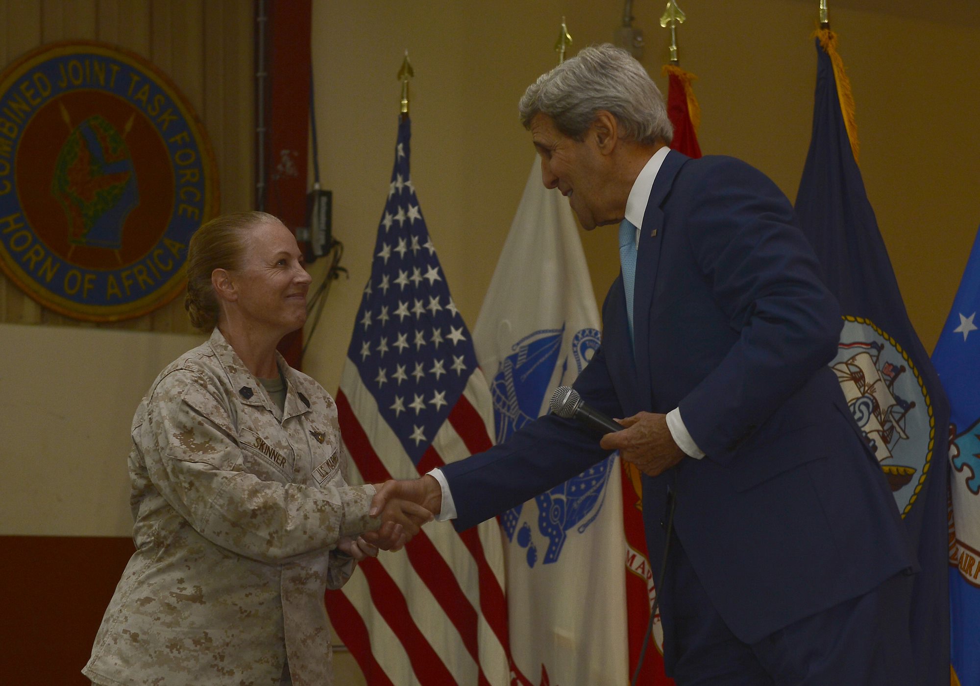John Kerry, U.S. Secretary of State recognized U.S. Marine Corps Sgt. Maj. Bonnie Skinner, Combined Joint Task Force- Horn of Africa command senior enlisted leader, during his remarks to Camp Lemonnier service members at Camp Lemonnier, Djibouti, May 6, 2015. Skinner was praised for her overall dedication during her two years at CJTF-HOA.