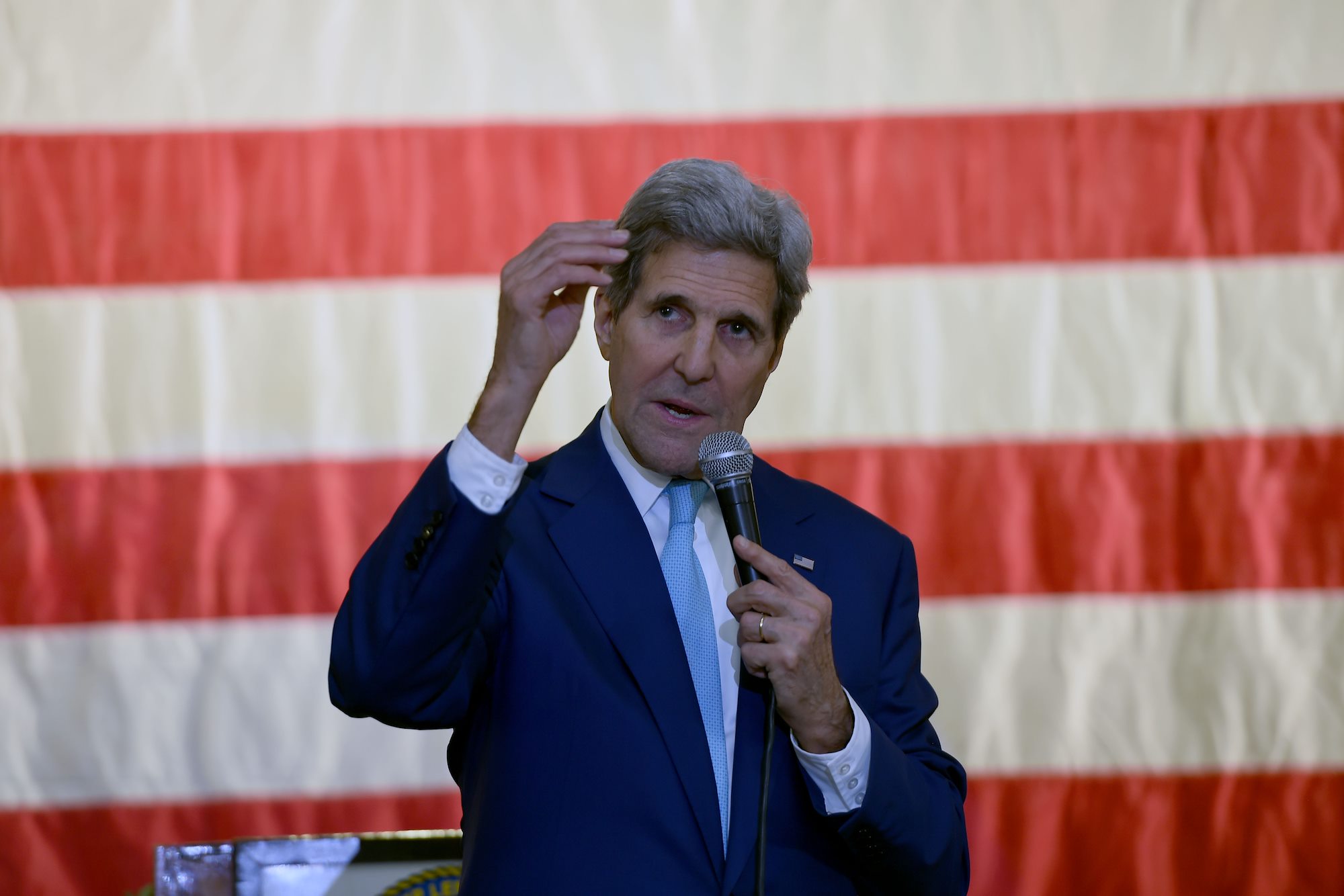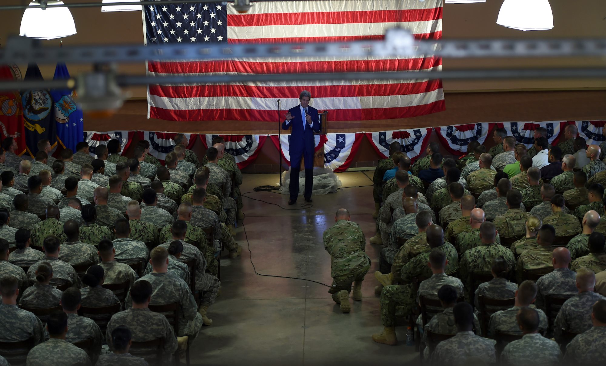 John Kerry, U.S. Secretary of State, answers military members questions regarding counter-terrorism initiatives during a visit to Camp Lemonnier, Djibouti, May 6, 2015. Camp Lemonnier is the only U.S. military installation in Africa. (U.S. Air Force photo by Senior Airman Nesha Humes/released)