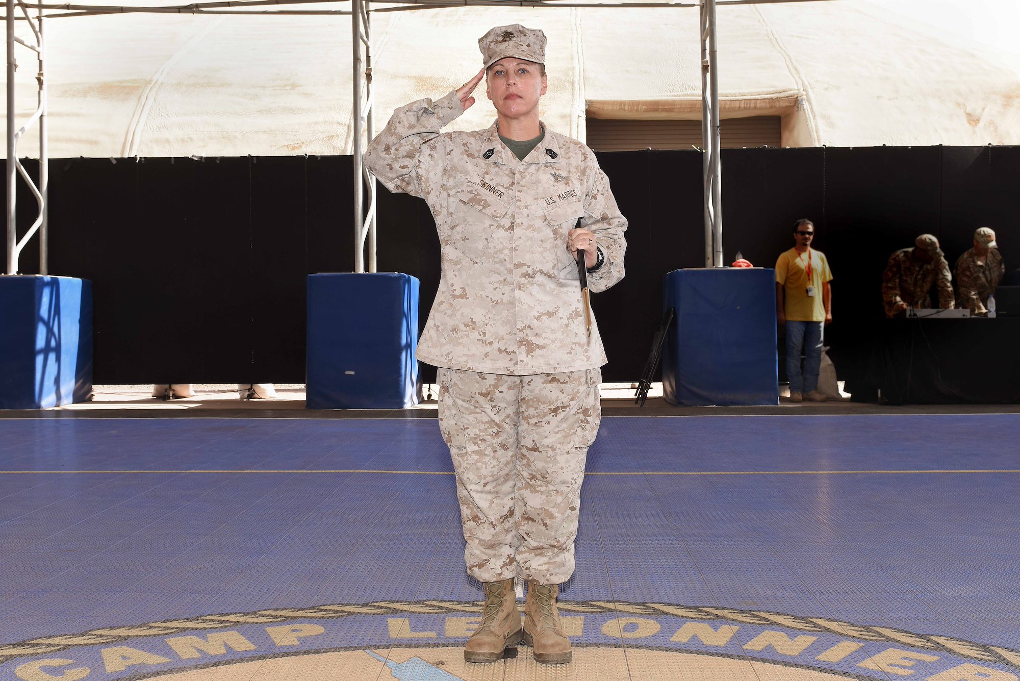 U.S. Marine Sgt. Maj. Bonnie Skinner, Combined Joint Task Force-Horn of Africa command senior enlisted leader, salutes the audience during a relinquishment of authority ceremony May 16, 2015 at Camp Lemonnier, Djibouti. (U.S. Air Force photo by Staff Sgt. Maria Bowman)
