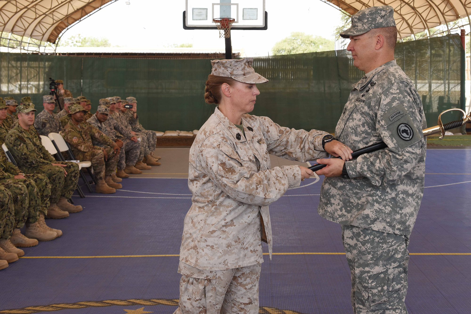U.S. Marine Sgt. Maj. Bonnie Skinner, Combined Joint Task Force-Horn of Africa command senior enlisted leader, passes the sword to Maj. Gen. Mark Stammer, CJTF-HOA commander, during a relinquishment of authority ceremony at Camp Lemonnier, Djibouti, May 15, 2015. (U.S. Air Force photo by Staff Sgt. Maria Bowman)