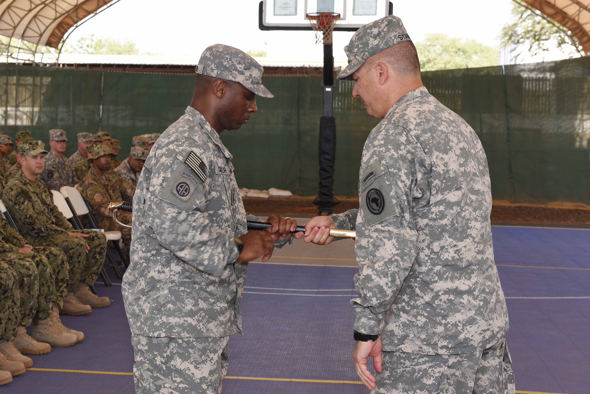 Maj. Gen. Mark Stammer, Combined Joint Task Force-Horn of Africa commander, passes the sword to U.S. Army Sgt. Maj. Claudell Taylor, during the relinquishment of authority ceremony at Camp Lemonnier, Djibouti, May 15, 2015. (U.S. Air Force photo by Staff Sgt. Maria Bowman)
