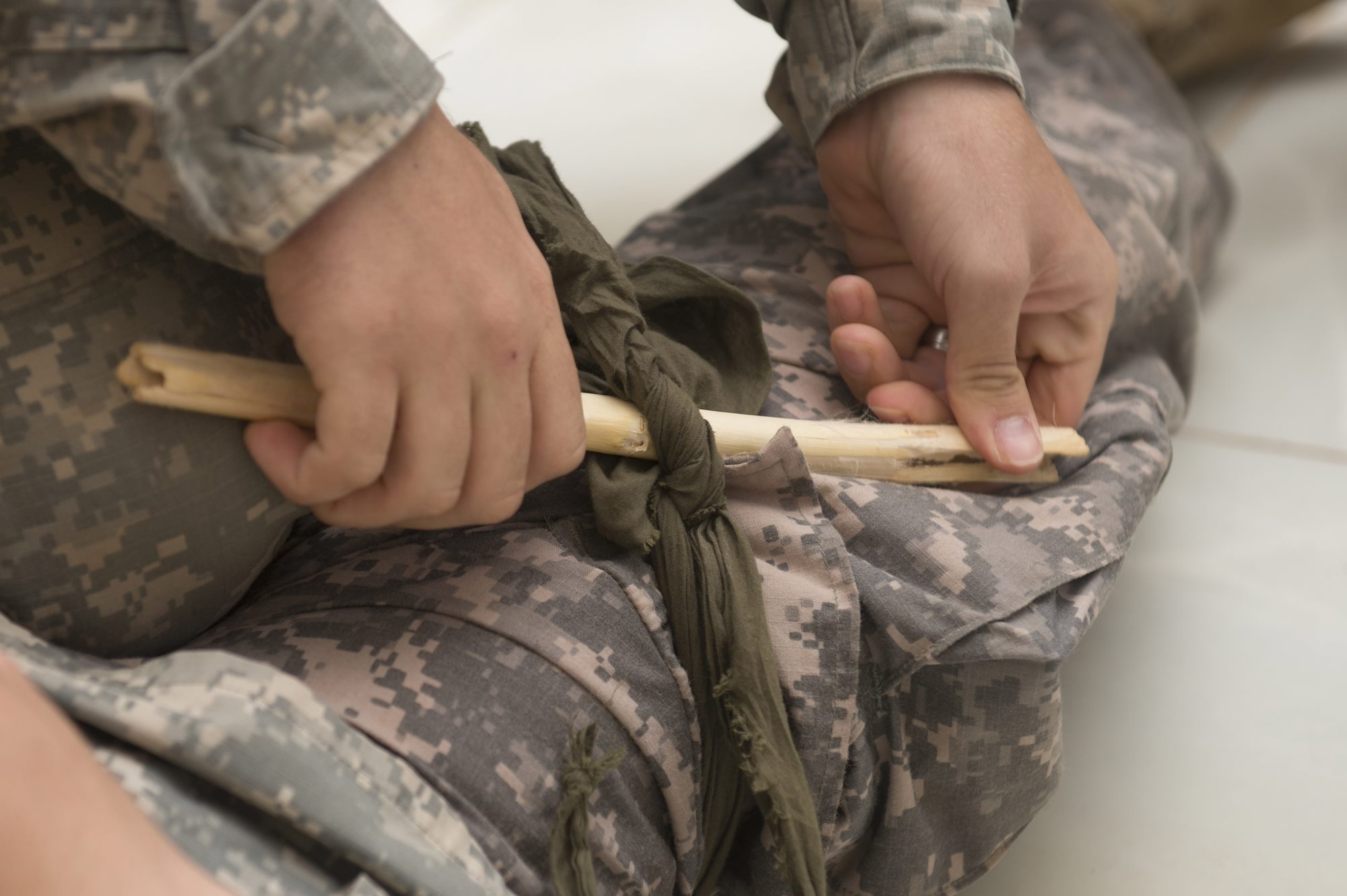 Two U.S. Army sergeants, display the way they are trained to apply a tourniquet during the First Aid Best Practice Exchange between, the Djibouti Gendarmerie, 404th and 407th Civil Affairs Battalions and the 1-77 Armored Regiment health care specialists in Cheik Moussa, Djibouti, Apr. 4, 2015. (U.S. Air Force Photos by Staff Sgt. Carlin Leslie)
