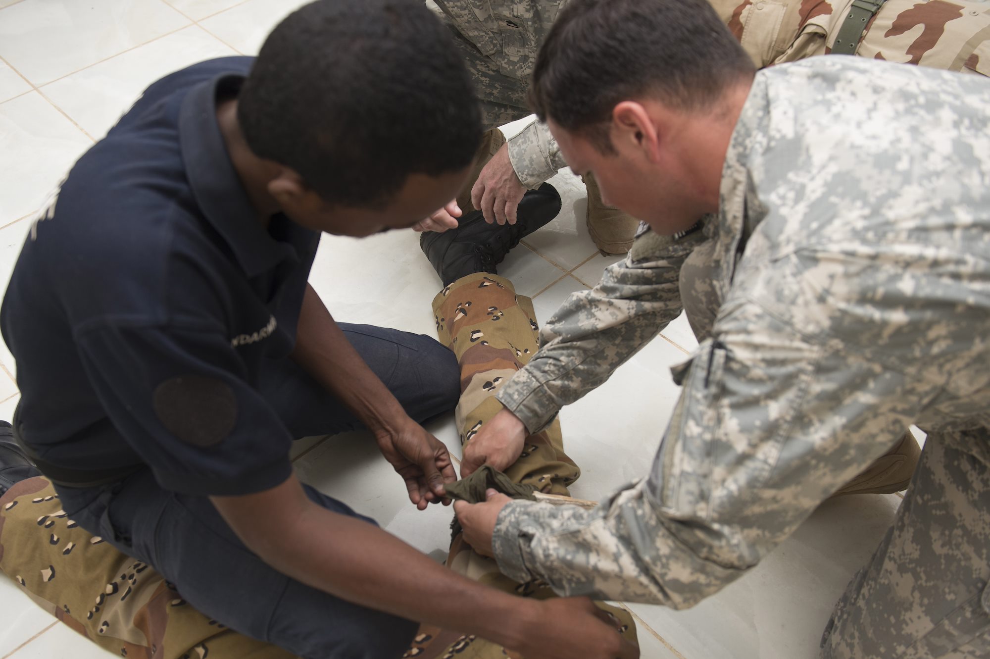 A Djiboutian Gendarmerie officer (Left) and Sergeant Richard Davies, 1-77 Armored Regiment health care specialist, work together to apply a tourniquet to a role-player during the First Aid Best Practice Exchange between, the Djibouti Gendarmerie, 404th and 407th Civil Affairs Battalions and the 1-77 Armored Regiment health care specialists in Cheik Moussa, Djibouti, Apr. 4, 2015. (U.S. Air Force Photos by Staff Sgt. Carlin Leslie)