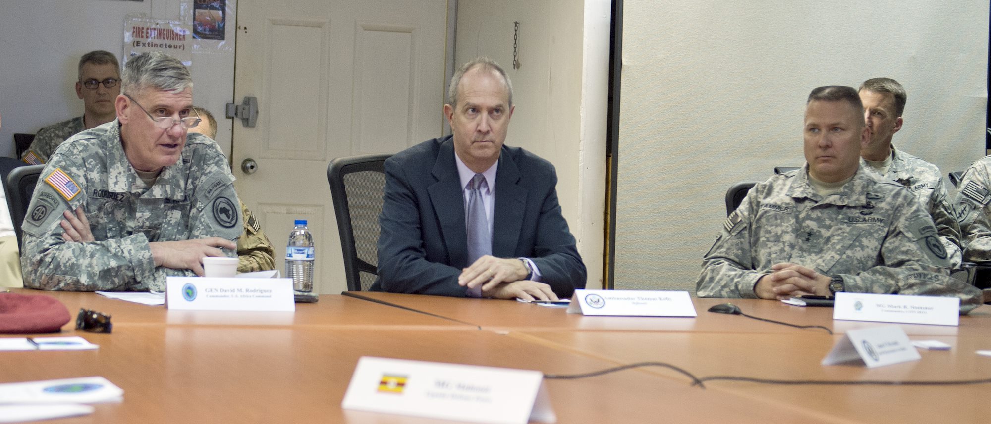 From left, U.S. Army General David Rodriguez, U.S. Africa Command commander, speaks with Ambassador Tom Kelly, U.S. Ambassador of Djibouti, and U.S. Army Maj. Gen. Mark Stammer, Combined Joint Task Force-Horn of Africa commanding general, during the U.S. Africa Command East Africa Joint Interagency, Intergovernmental, and Multinational conference at Camp Lemonnier, Djibouti, April 14, 2015. The event was a forum for regional U.S. Embassy and East African partner nation representatives to gain greater insight into each other’s goals and objectives within the East Africa region. (U.S. Air Force photo by Staff Sgt. Kevin Iinuma)