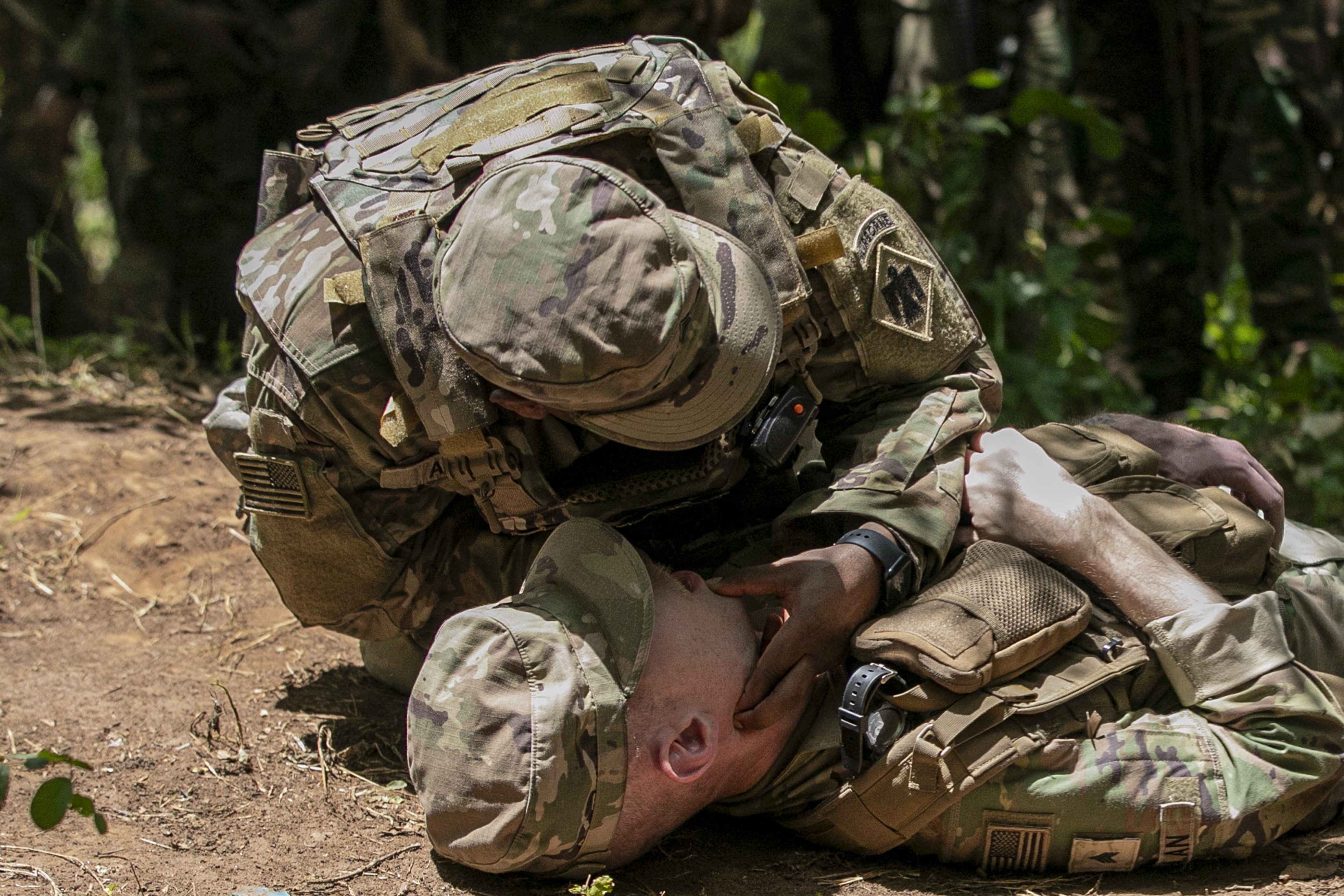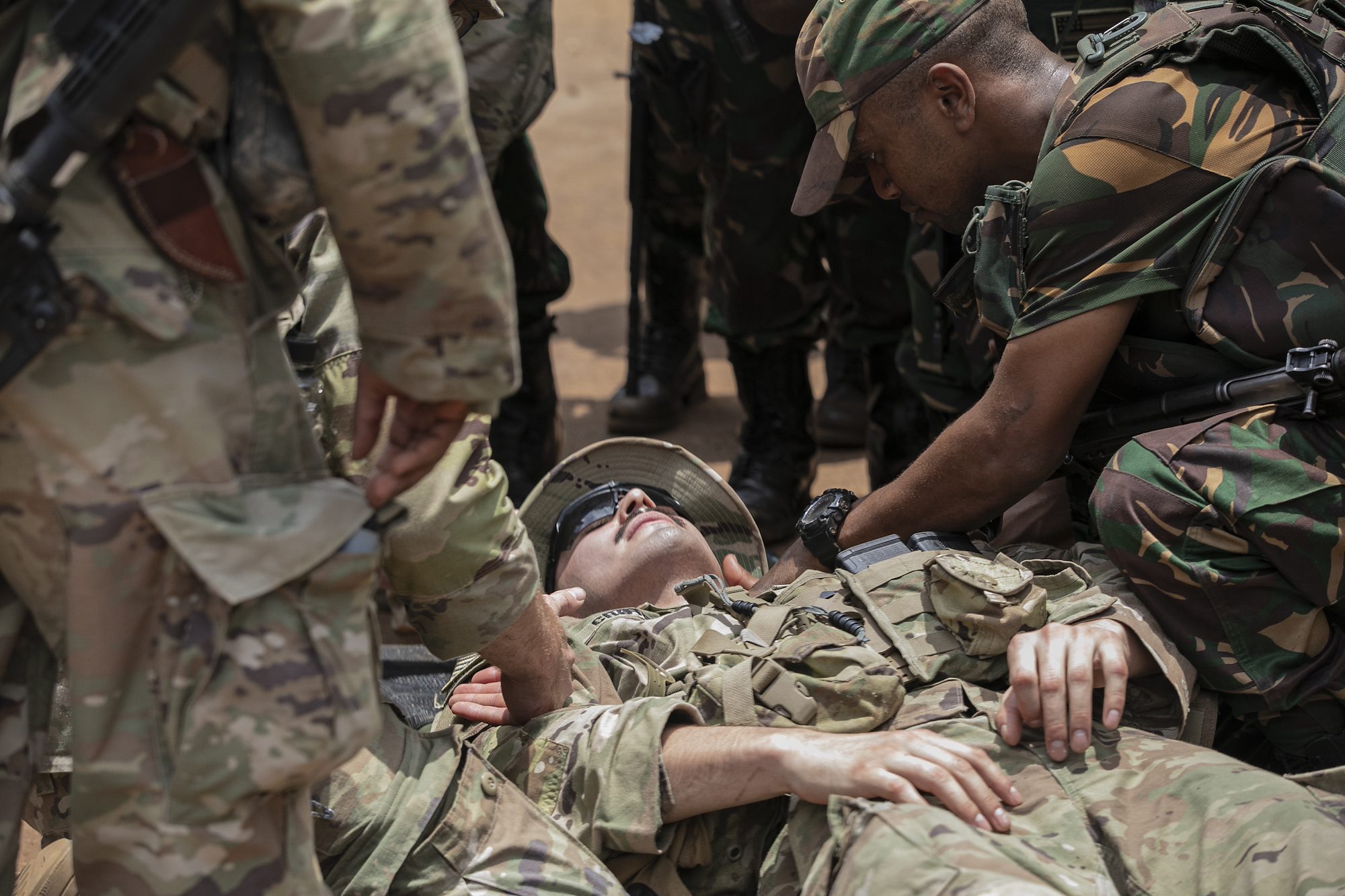 U.S. Army soldiers with the East Africa Response Force (EARF), assigned to Combined Joint Task Force – Horn of Africa (CJTF-HOA) demonstrate how to check for breathing with Tanzania People’s Defense Force (TPDF) service members during tactical combat casualty care (TCCC) on day one of exercise Justified Accord 2025 (JA25), at the Msata Military Training Base in Msata, Tanzania, Feb. 11, 2025. JA25 is the premier U.S. Africa Command (USAFRICOM) exercise in East Africa, designed to enhance multinational combat readiness, strengthen crisis response capabilities and empower allies and partners in the region. Led by U.S. Army Southern European Task Force, Africa (SETAF-AF) and hosted by Kenya, Djibouti and Tanzania, JA25 integrates high-intensity training scenarios that sharpen warfighting skills, increase operational reach and enhance the ability to execute complex joint and multinational operations. (U.S. Army photo by Sgt. Michael Knight)