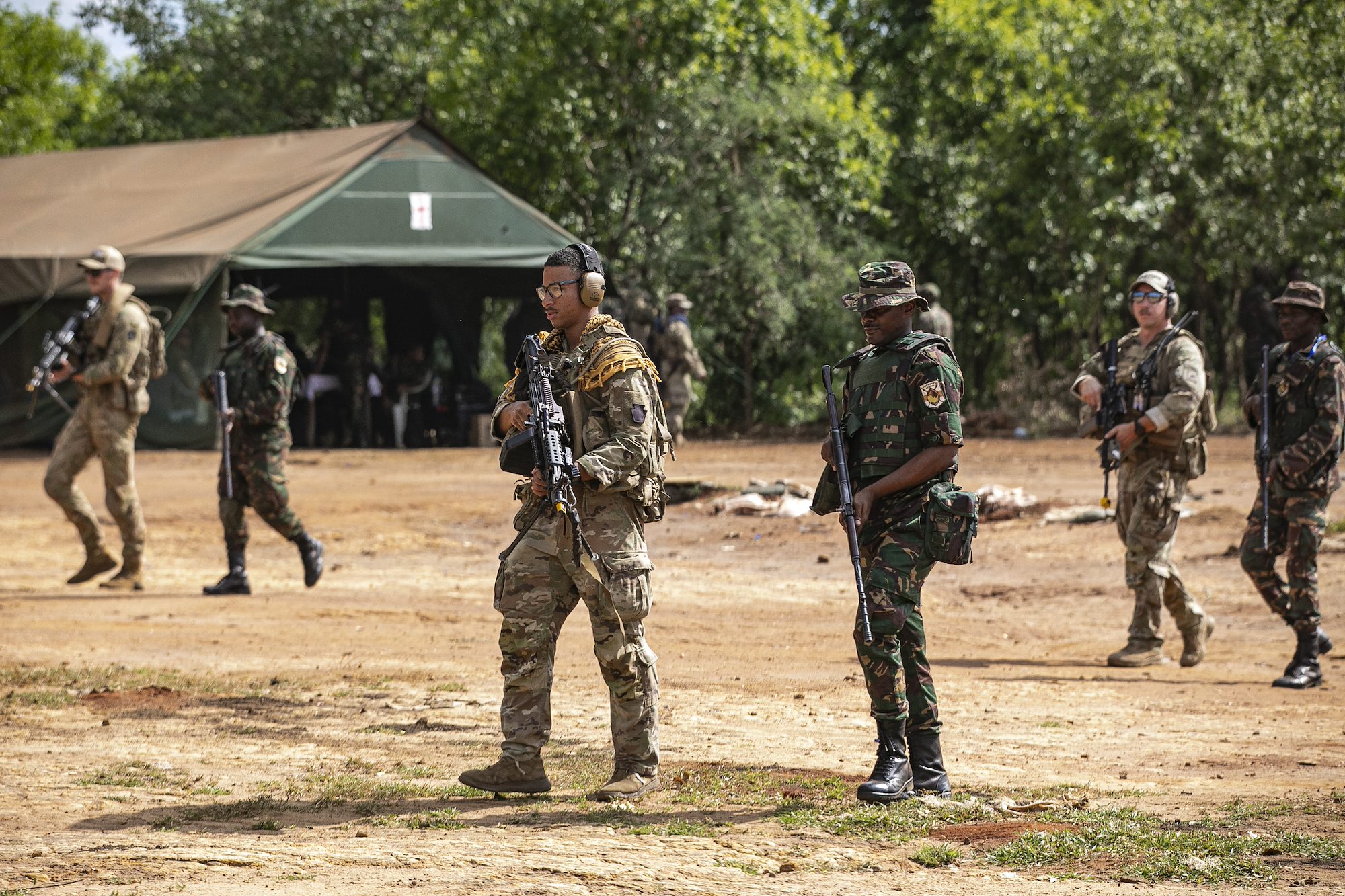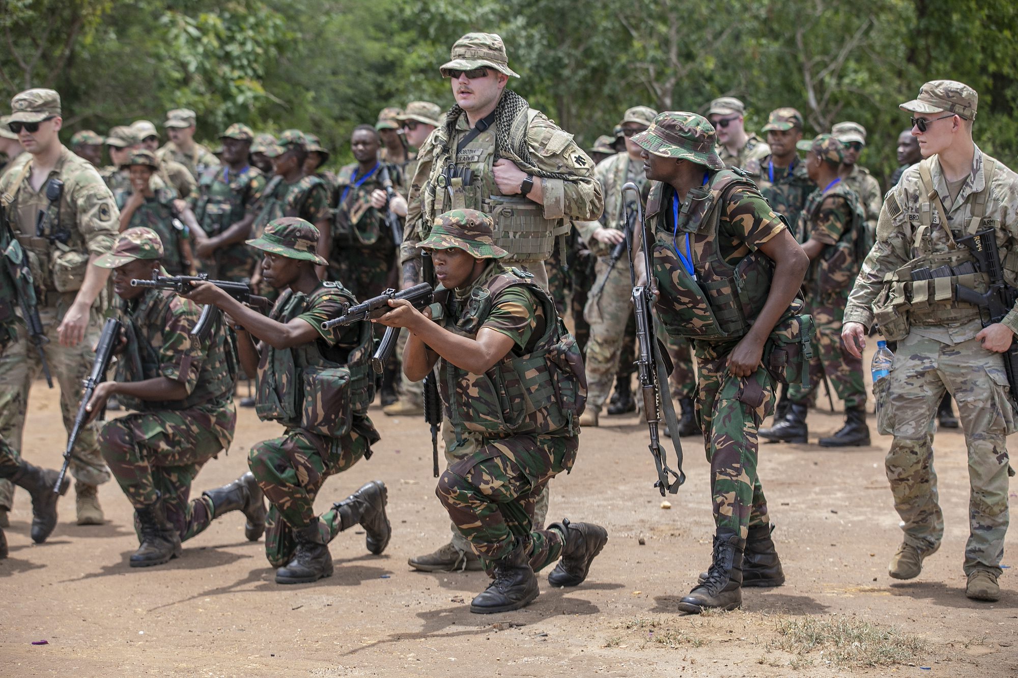 U.S. Army soldiers with the East Africa Response Force (EARF), assigned to Combined Joint Task Force – Horn of Africa (CJTF-HOA) and Tanzania People’s Defense Force (TPDF) service members practice squad attack battle drill tactics on day two of exercise Justified Accord 2025 (JA25), at the Msata Military Training Base in Msata, Tanzania, Feb. 12, 2025. JA25 is the premier U.S. Africa Command (USAFRICOM) exercise in East Africa, designed to enhance multinational combat readiness, strengthen crisis response capabilities and empower allies and partners in the region. Led by U.S. Army Southern European Task Force, Africa (SETAF-AF) and hosted in Kenya, Djibouti and Tanzania, JA25 integrates high-intensity training scenarios that sharpen warfighting skills, increase operational reach and enhance the ability to execute complex joint and multinational operations. The exercise runs from Feb. 10–21, 2025. (U.S. Army photo by Sgt. Michael Knight)