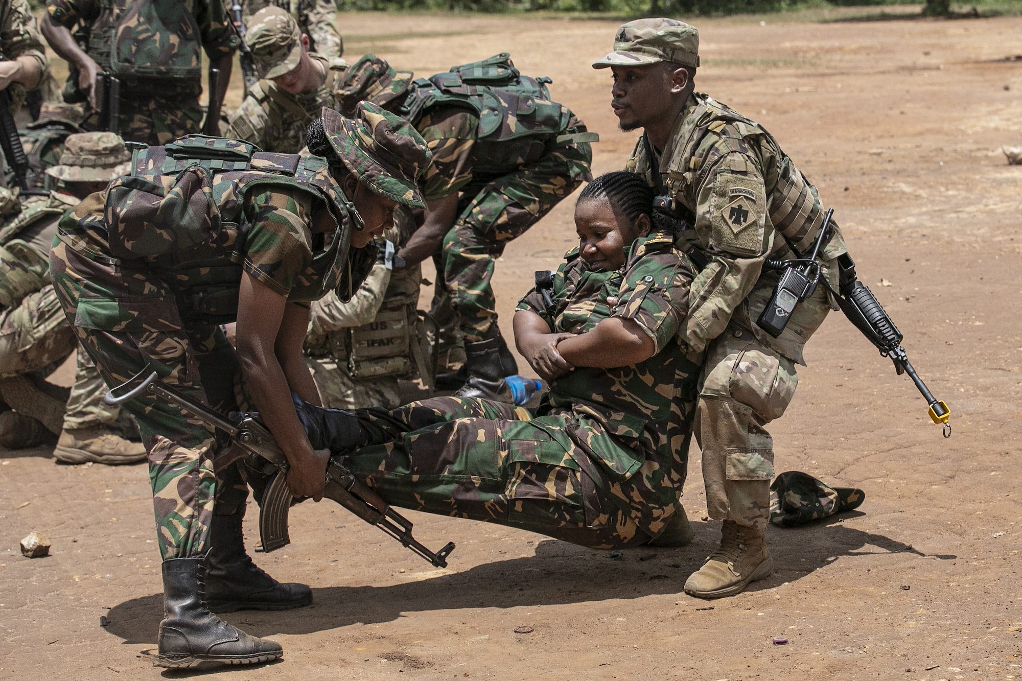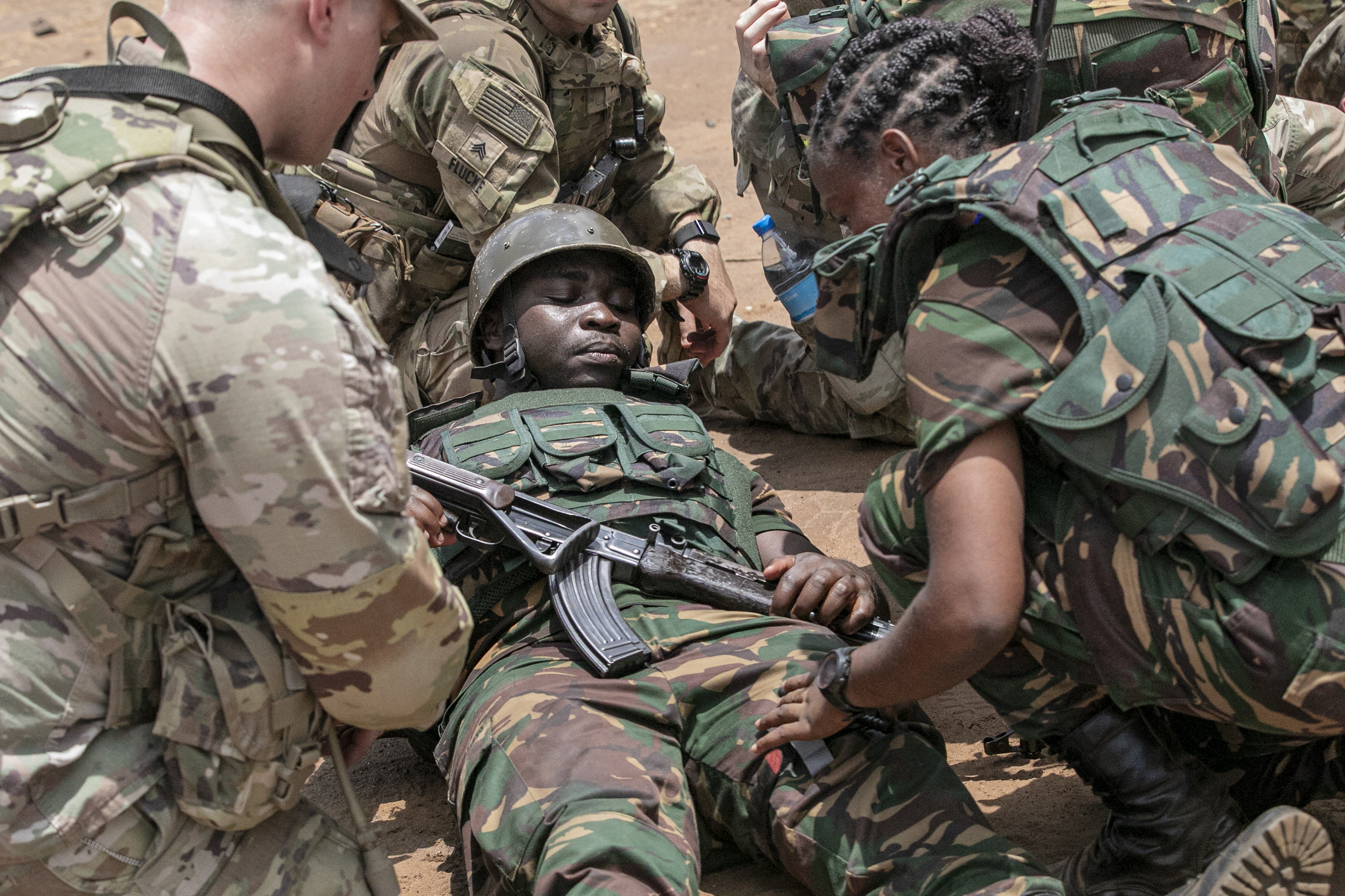 U.S. Army soldiers with the East Africa Response Force (EARF), assigned to Combined Joint Task Force – Horn of Africa (CJTF-HOA), conduct tactical combat casualty care (TCCC) training with U.S. Army Southern European Task Force, Africa (SETAF-AF), and the Tanzania People’s Defense Force (TPDF) during day one of exercise Justified Accord 2025 (JA25), at the Msata Military Training Base in Msata, Tanzania, Feb. 11, 2025. JA25 is the premier U.S. Africa Command (USAFRICOM) exercise in East Africa, designed to enhance multinational combat readiness, strengthen crisis response capabilities and empower allies and partners in the region. Led by U.S. Army Southern European Task Force, Africa (SETAF-AF) and hosted by Kenya, Djibouti and Tanzania, JA25 integrates high-intensity training scenarios that sharpen warfighting skills, increase operational reach and enhance the ability to execute complex joint and multinational operations. (U.S. Army photo by Sgt. Michael Knight)