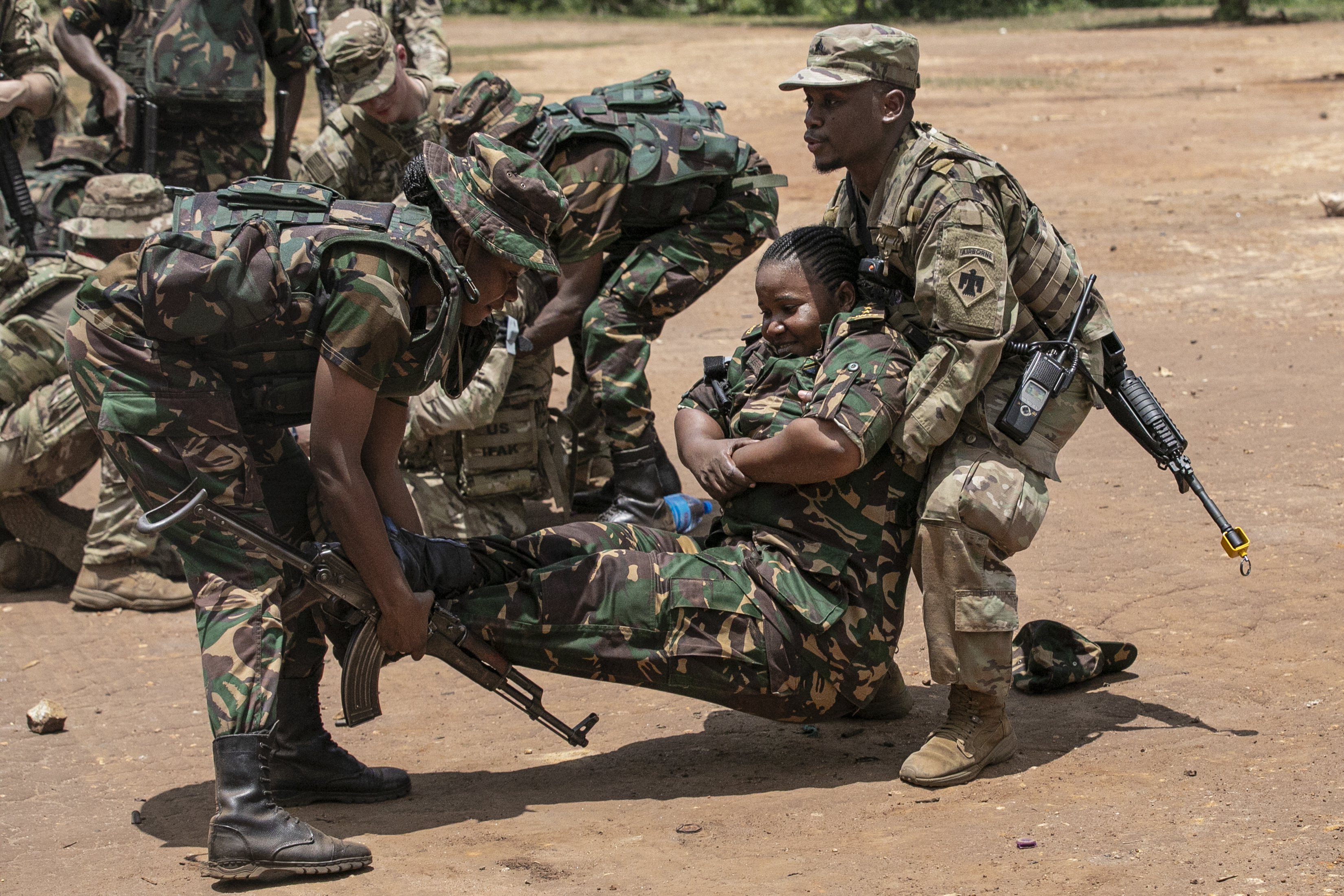 U.S. Army soldiers and members of the Tanzania People’s Defense Force (TPDF) conduct a team buddy carry during tactical combat casualty care (TCCC) on day one of exercise Justified Accord 2025 (JA25) at the Msata Military Training Base in Msata, Tanzania, Feb. 11, 2025. JA25 is the premier U.S. Africa Command (USAFRICOM) exercise in East Africa, designed to enhance multinational combat readiness, strengthen crisis response capabilities and empower allies and partners in the region. Led by U.S. Army Southern European Task Force, Africa (SETAF-AF) and hosted by Kenya, Djibouti and Tanzania, JA25 integrates high-intensity training scenarios that sharpen warfighting skills, increase operational reach and enhance the ability to execute complex joint and multinational operations. (U.S. Army photo by Sgt. Michael Knight)