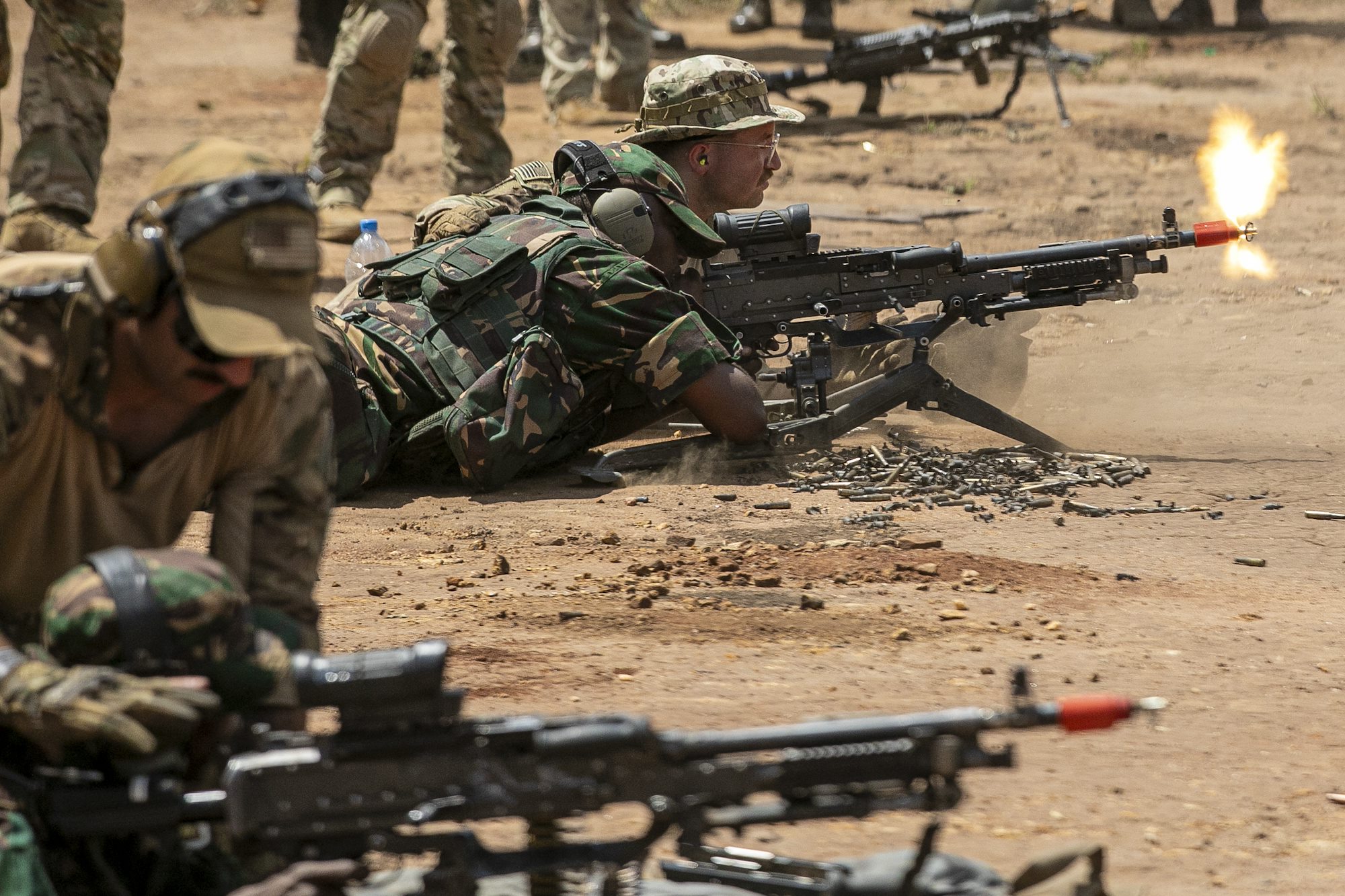 A Tanzania People’s Defense Force (TPDF) service member practices weapon fundamentals with a M240 machine gun on day two of exercise Justified Accord 2025 (JA25), at the Msata Military Training Base in Msata, Tanzania, Feb. 12, 2025. JA25 is the premier U.S. Africa Command (USAFRICOM) exercise in East Africa, designed to enhance multinational combat readiness, strengthen crisis response capabilities and empower allies and partners in the region. Led by U.S. Army Southern European Task Force, Africa (SETAF-AF) and hosted in Kenya, Djibouti and Tanzania, JA25 integrates high-intensity training scenarios that sharpen warfighting skills, increase operational reach and enhance the ability to execute complex joint and multinational operations. The exercise runs from Feb. 10–21, 2025. (U.S. Army photo by Sgt. Michael Knight)
